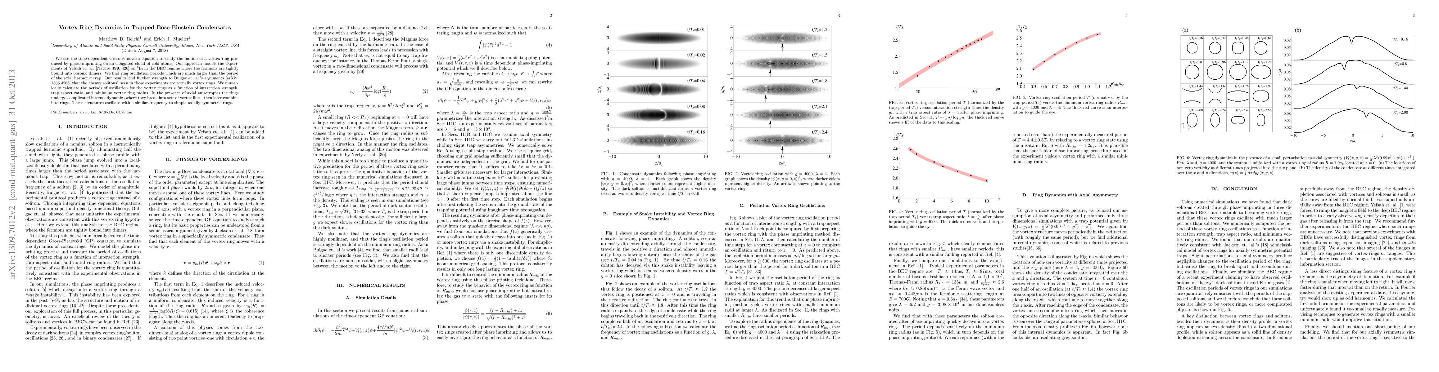 Researchers studied vortex ring dynamics in trapped Bose-Einstein condensates using a numerical model, finding oscillation periods that contradict previous assumptions about the nature of 'heavy solitons' in similar experiments.