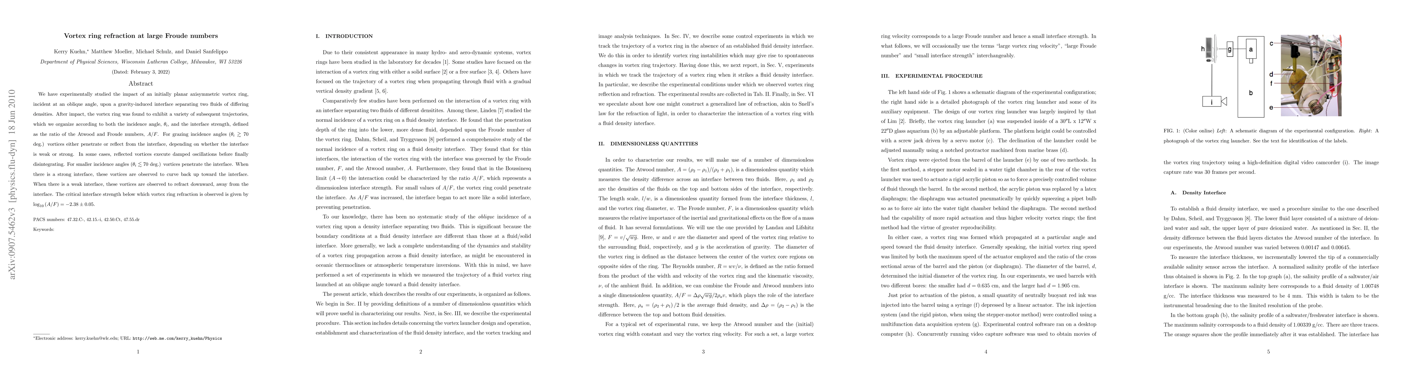 We have experimentally studied the impact of an initially planar axisymmetric vortex ring, incident at an oblique angle, upon a gravity-induced interface separating two fluids of differing densities. After impact, the vortex ring was found to exhibit a variety of subsequent trajectories, which we organize according to both the incidence angle, $\theta_i$, and the interface strength, defined as the ratio of the Atwood and Froude numbers, $A/F$. For grazing incidence angles ($\theta_i \gtrsim 70$ deg.) vortices either penetrate or reflect from the interface, depending on whether the interface is weak or strong. In some cases, reflected vortices execute damped oscillations before finally disintegrating. For smaller incidence angles ($\theta_i \lesssim 70$ deg.) vortices penetrate the interface. When there is a strong interface, these vortices are observed to curve back up toward the interface. When there is a weak interface, these vortices are observed to refract downward, away from the interface. The critical interface strength below which vortex ring refraction is observed is given by $\log_{10}{(A/F)}= -2.38 \pm 0.05$.