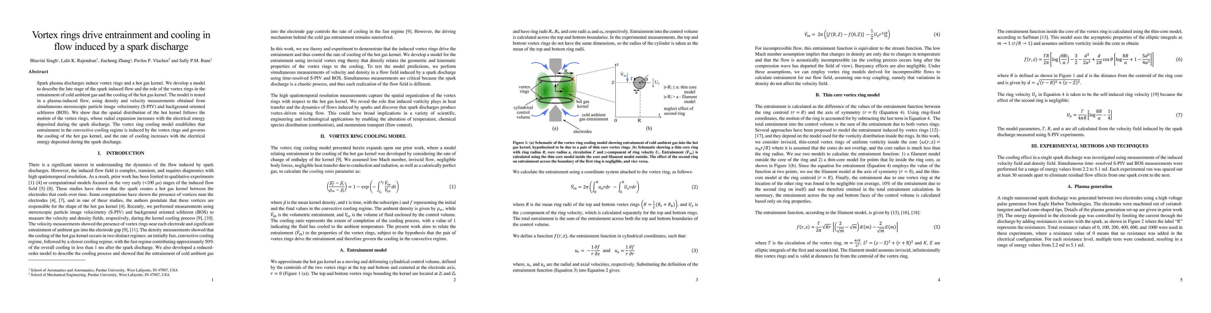 A model shows that vortex rings in spark plasma discharges drive cooling of a hot gas kernel by entraining cold ambient gas. The rate of cooling increases with the electrical energy deposited during the discharge.