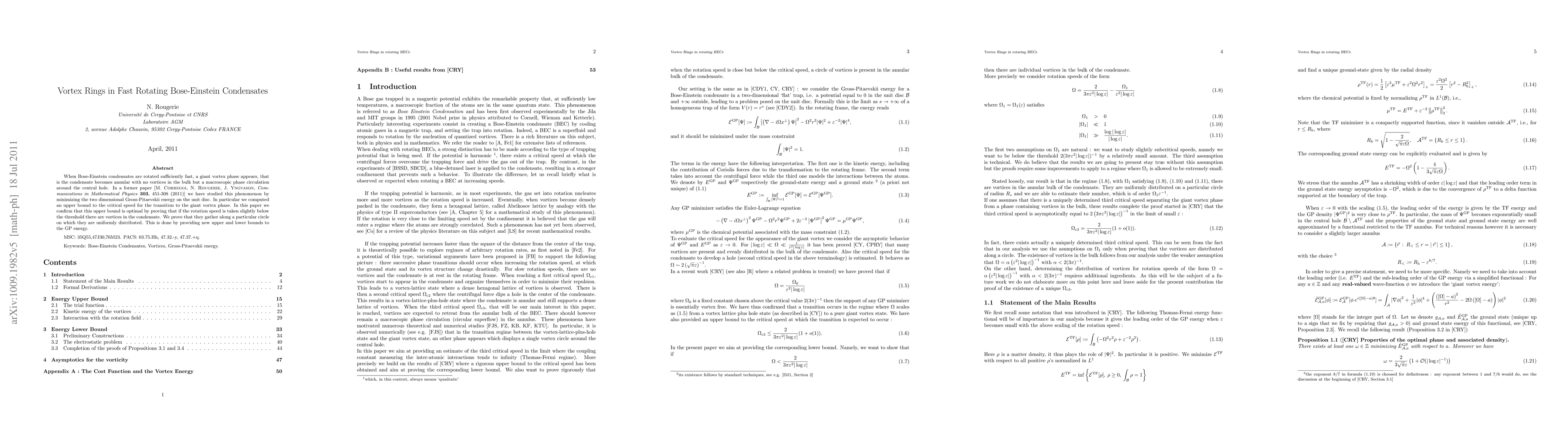 Researchers confirmed an optimal upper bound for the critical speed to transition from a normal Bose-Einstein condensate to a giant vortex phase when rapidly rotating. They found that at speeds below this threshold, vortices form along a specific circle in the condensate.