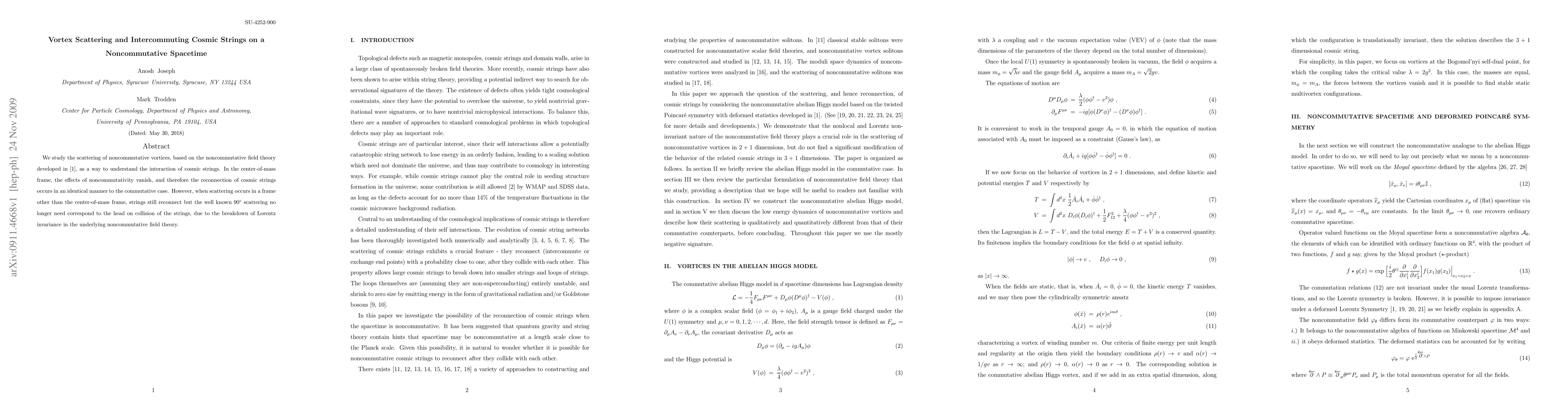 This paper investigates the scattering behavior of noncommutative vortices to understand cosmic string interactions in a noncommutative spacetime. While reconnection occurs similarly to the commutative case in the center-of-mass frame, noncommutativity alters scattering dynamics in other frames, breaking Lorentz invariance and modifying the typical 90-degree scattering angle.