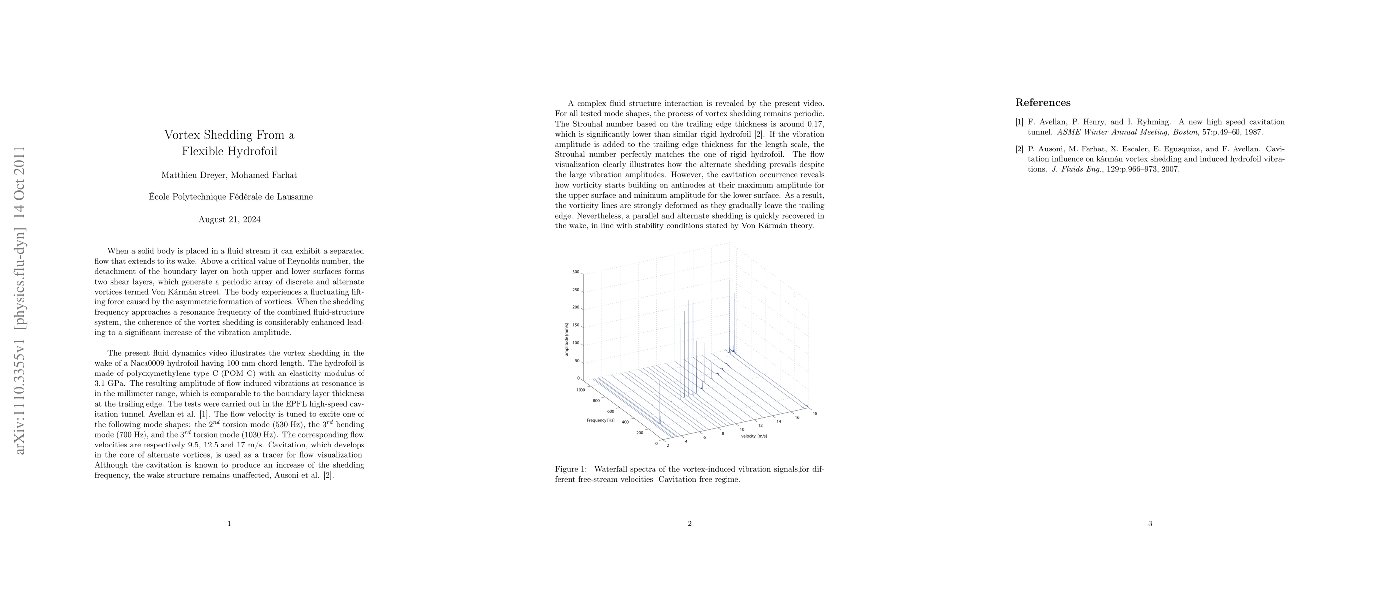 This study investigates vortex shedding from the wake of a flexible NACA0009 hydrofoil made of polyoxymethylene type C (POM C), captured in a video submitted to the Gallery of Fluid Motion 2011, showcasing fluid dynamics phenomena.