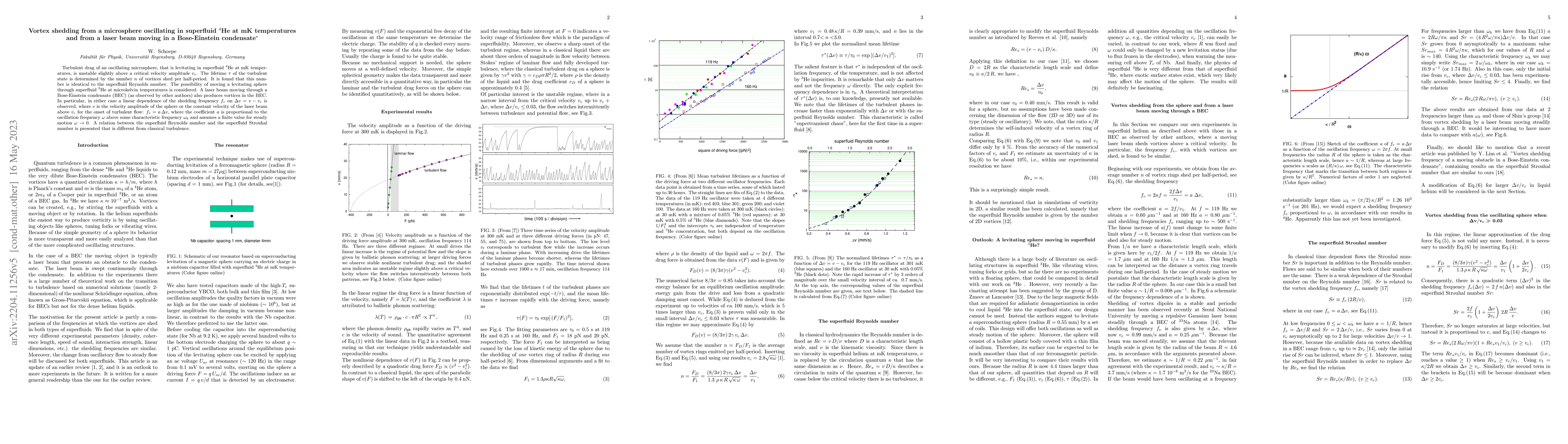 Turbulent drag of an oscillating microsphere, that is levitating in superfluid $^4$He at mK temperatures, is unstable slightly above a critical velocity amplitude $v_c$. The lifetime $\tau$ of the turbulent state is determined by the number $n$ of vortices shed per half-period. It is found that this number is identical to the superfluid Reynolds number. The possibility of moving a levitating sphere through superfluid $^3$He at microkelvin temperatures is considered. A laser beam moving through a Bose-Einstein condensate (BEC) (as observed by other authors) also produces vortices in the BEC. In particular, in either case a linear dependence of the shedding frequency $f_v$ on $\Delta v = v - v_c$ is observed, where $v$ is the velocity amplitude of the sphere or the constant velocity of the laser beam above $v_c$ for the onset of turbulent flow: $f_v = a \Delta v$, where the coefficient $a$ is proportional to the oscillation frequency $ \omega $ above some characteristic frequency $\omega_k$ and assumes a finite value for steady motion $\omega \rightarrow 0$. A relation between the superfluid Reynolds number and the superfluid Strouhal number is presented that is different from classical turbulence.