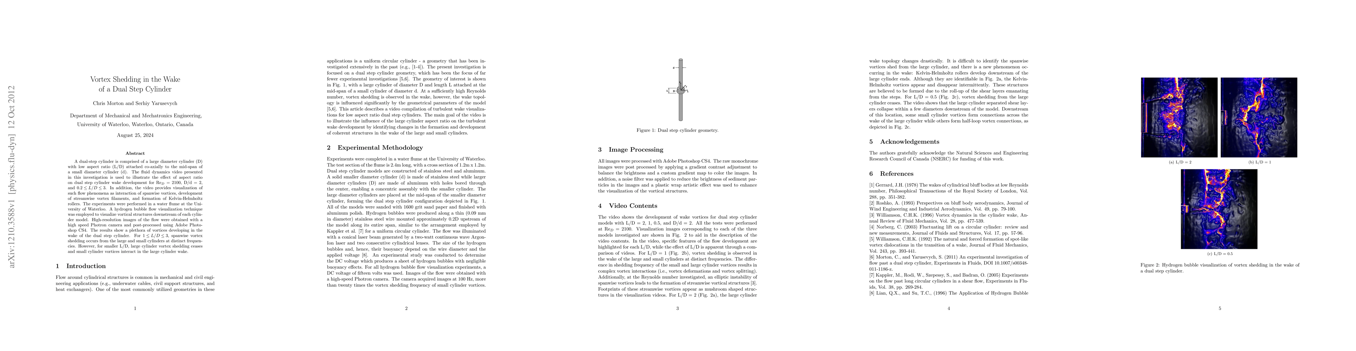 A dual-step cylinder is comprised of a large diameter cylinder (D) with low aspect ratio (L/D) attached co-axially to the mid-span of a small diameter cylinder (d). The fluid dynamics video presented in this investigation is used to illustrate the effect of aspect ratio on dual step cylinder wake development for Re = 2100, D/d = 2, and 0.2 < L/D < 3. In addition, the video provides visualization of such flow phenomena as interaction of spanwise vortices, development of streamwise vortex filaments, and formation of Kelvin-Helmholtz rollers. The experiments were performed in a water flume at the University of Waterloo. A hydrogen bubble flow visualization technique was employed to visualize vortical structures downstream of each cylinder model. High-resolution images of the flow were obtained with a high speed Photron camera and post-processed using Adobe Photoshop CS4. The results show a plethora of vortices developing in the wake of the dual step cylinder. For 1 < L/D < 3, spanwise vortex shedding occurs from the large and small cylinders at distinct frequencies. However, for smaller L/D, large cylinder vortex shedding ceases and small cylinder vortices interact in the large cylinder wake.
