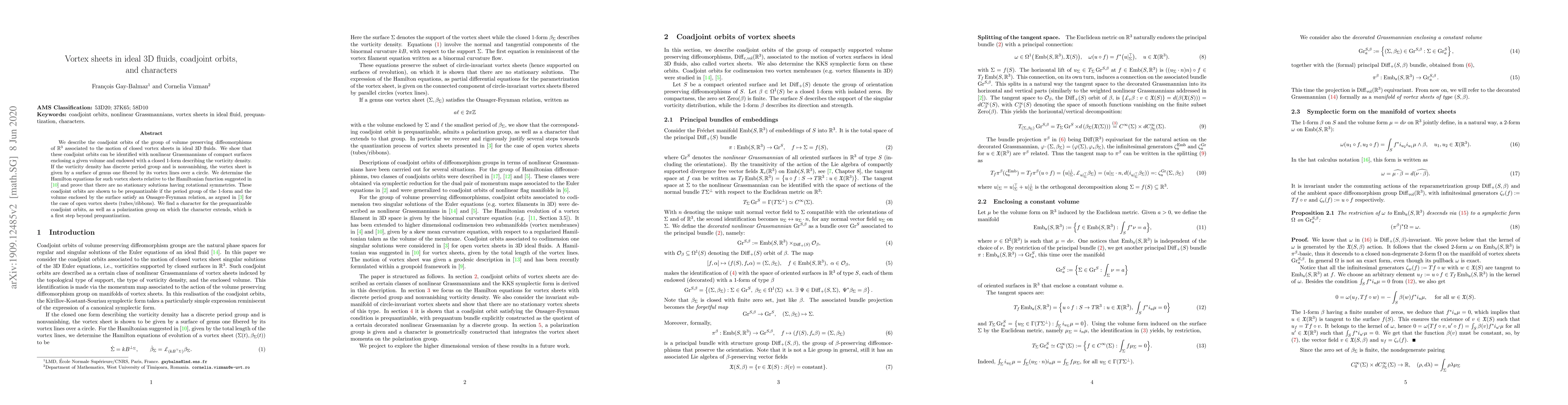 This paper explores the coadjoint orbits of volume-preserving diffeomorphisms linked to vortex sheets in ideal 3D fluids, identifying them with nonlinear Grassmannians. It proves the absence of rotationally symmetric stationary solutions and introduces a character for prequantizable coadjoint orbits under specific conditions.