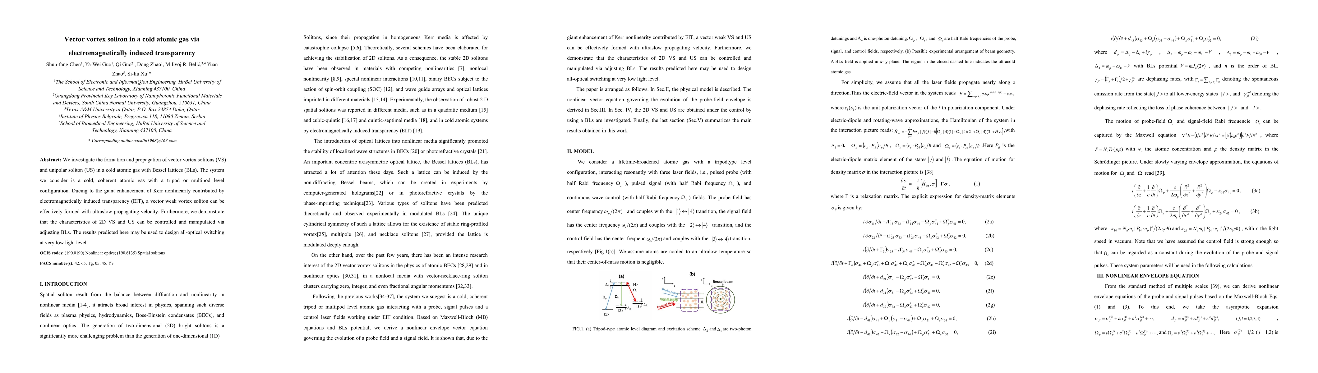 The paper presents a novel approach to forming and controlling vector vortex solitons and unipolar solitons in cold atomic gases using EIT-enhanced Kerr nonlinearity and Bessel lattices.