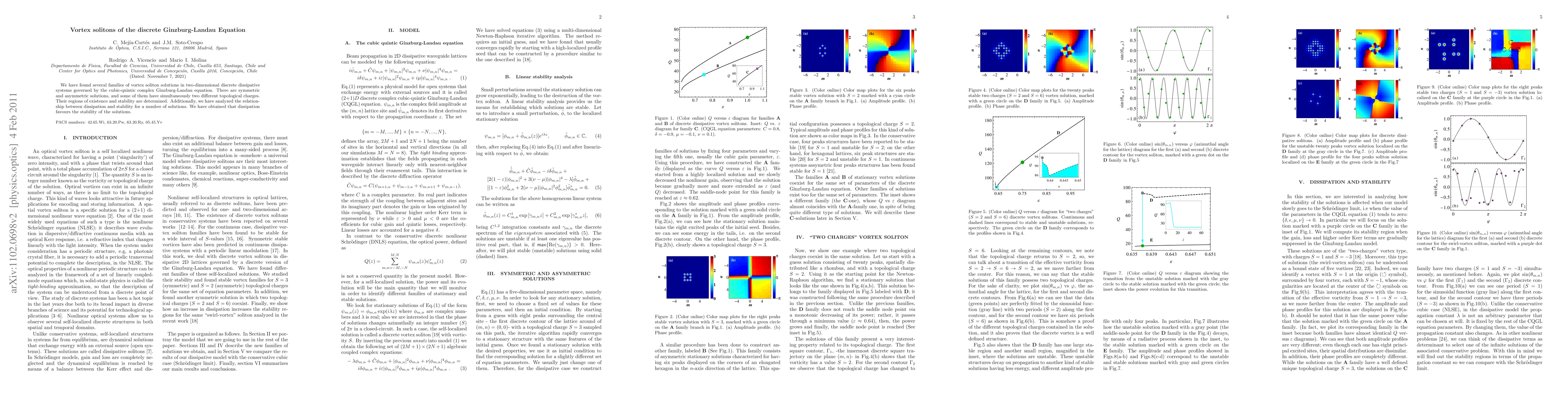The paper presents a detailed analysis of vortex soliton solutions in dissipative systems governed by the cubic-quintic complex Ginzburg-Landau equation, including stability analysis and the discovery of solutions with multiple topological charges.