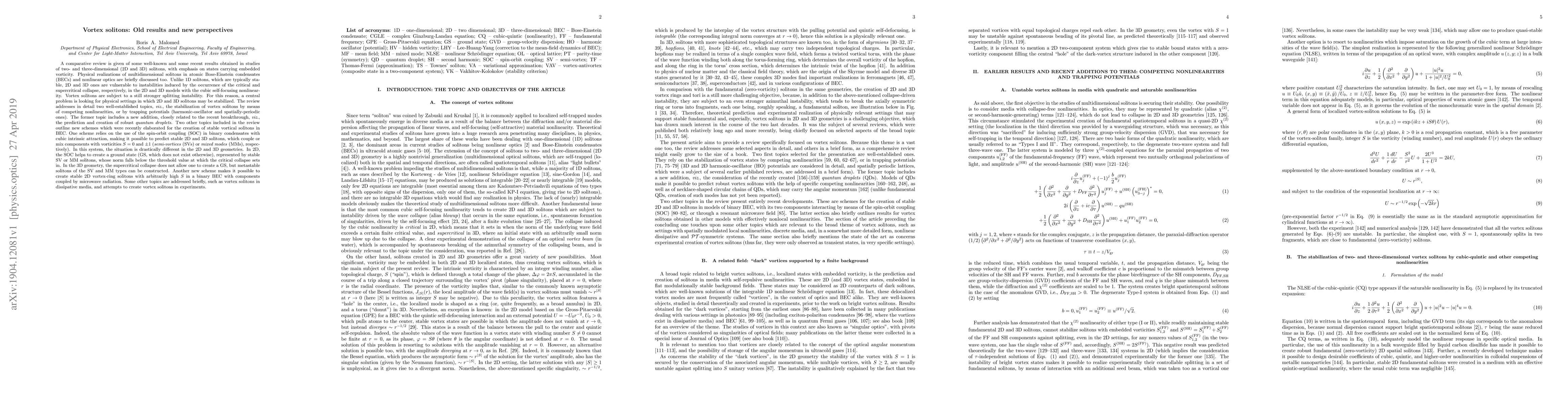 A review is given of some well-known and some recent results for two- and three-dimensional (2D and 3D) solitons, with emphasis on states carrying embedded vorticity. Unlike typically stable 1D solitons, 2D and 3D ones are vulnerable to instabilities induced by the critical and supercritical collapse, respectively, in the 2D and 3D models with cubic focusing nonlinearity. Vortex solitons are subject to a still stronger splitting instability. For this reason, a central problem is looking for physical settings in which 2D and 3D solitons may be stabilized. The review addresses, first, two well-established topics, viz., the stabilization of vortex solitons by means of competing nonlinearities, or by trapping potentials (harmonic-oscillator and spatially-periodic ones). The former topic includes a new addition, viz., the prediction of robust quantum droplets. Two other topics outline new schemes elaborated for the creation of stable vortical solitons. One scheme relies on the use of spin-orbit coupling (SOC) in binary BEC, making it possible to predict stable 2D and 3D solitons, which couple or mix components with vorticities S=0 and (+/-)1 (semi-vortices (SVs) or mixed modes (MMs), respectively). In this system, the situation is different in the 2D and 3D geometries. In 2D, SOC helps to create a ground state (GS), represented by stable SV or MM solitons, whose norm falls below the threshold value at which the critical collapse sets in. In the 3D geometry, the supercritical collapse does not allow one to create a GS, but metastable solitons of the SV and MM types can be constructed. Another new scheme makes it possible to create stable 2D vortex-ring solitons with arbitrarily high S in a binary BEC with components coupled by microwave radiation. Some other topics are addressed too, such as vortex solitons in dissipative media and attempts to create vortex solitons in experiments.
