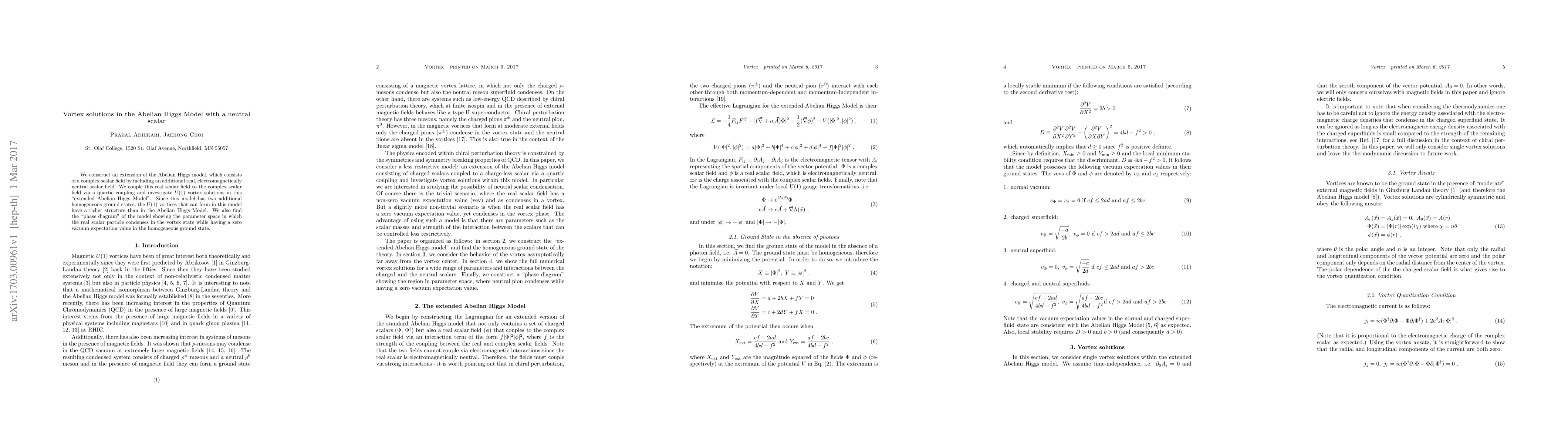 Researchers extend the Abelian Higgs model with a neutral scalar field to study vortex solutions, revealing richer vortices due to two additional ground states and a phase diagram showing parameter conditions for real scalar condensation.