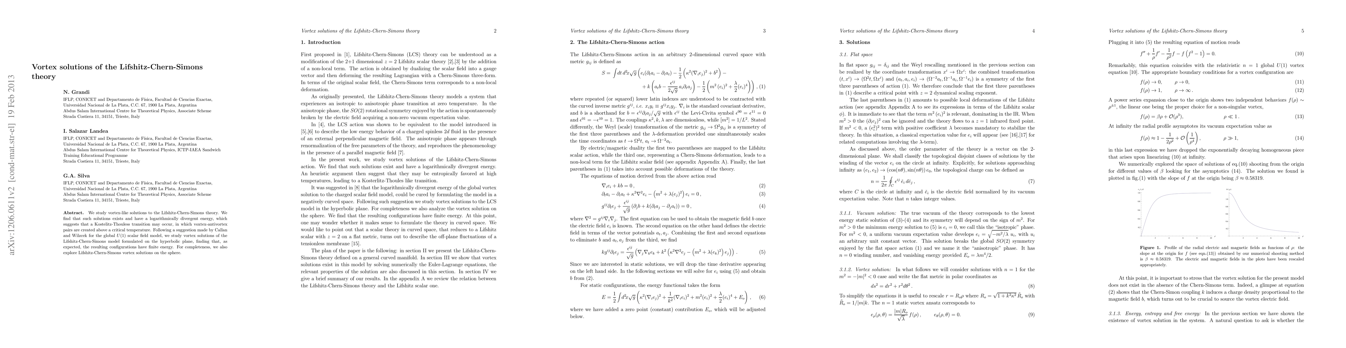 We study vortex-like solutions to the Lifshitz-Chern-Simons theory. We find that such solutions exists and have a logarithmically divergent energy, which suggests that a Kostelitz-Thouless transition may occur, in which voxtex-antivortex pairs are created above a critical temperature. Following a suggestion made by Callan and Wilzcek for the global U(1) scalar field model, we study vortex solutions of the Lifshitz-Chern-Simons model formulated on the hyperbolic plane, finding that, as expected, the resulting configurations have finite energy. For completeness, we also explore Lifshitz-Chern-Simons vortex solutions on the sphere.