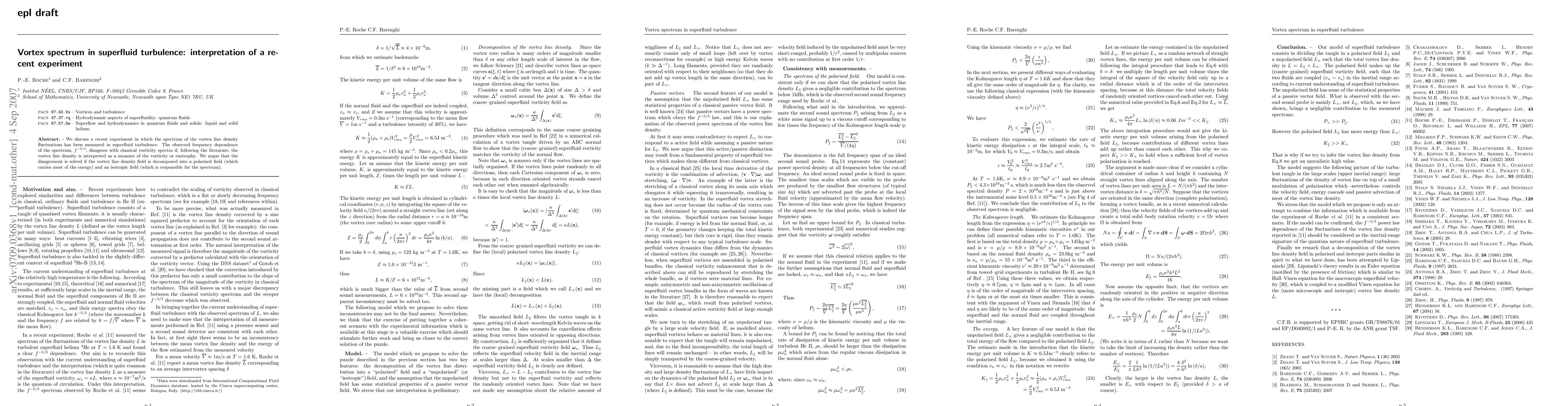 We discuss a recent experiment in which the spectrum of the vortex line density fluctuations has been measured in superfluid turbulence. The observed frequency dependence of the spectrum, $f^{-5/3}$, disagrees with classical vorticity spectra if, following the literature, the vortex line density is interpreted as a measure of the vorticity or enstrophy. We argue that the disagrement is solved if the vortex line density field is decomposed into a polarised field (which carries most of the energy) and an isotropic field (which is responsible for the spectrum).