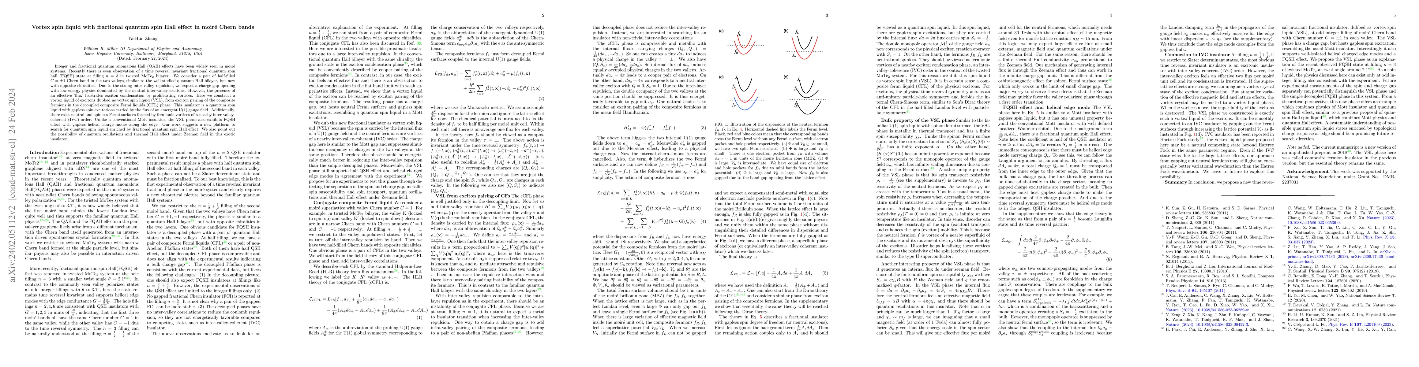 Integer and fractional quantum anomalous Hall (QAH) effects have been widely seen in moir\'e systems. Recently there is even observation of a time reversal invariant fractional quantum spin hall (FQSH) state at filling $n=3$ in twisted MoTe$_2$ bilayer. We consider a pair of half-filled $C=\pm 1$ Chern band in the two valleys, similar to the well-studied quantum Hall bilayer, but now with opposite chiralities. Due to the strong inter-valley repulsion, we expect a charge gap opening with low energy physics dominated by the neutral inter-valley excitons. However, the presence of an effective `flux' frustrates exciton condensation by proliferating vortices. Here we construct a vortex liquid of excitons dubbed as vortex spin liquid (VSL), from exciton pairing of the composite fermions in the decoupled composite Fermi liquids (CFL) phase. This insulator is a quantum spin liquid with gapless spin excitations carried by the flux of an emergent U(1) gauge field. Additionally, there exist neutral and spinless Fermi surfaces formed by fermionic vortices of a nearby inter-valley-coherent (IVC) order. Unlike a conventional Mott insulator, the VSL phase also exhibits FQSH effect with gapless helical charge modes along the edge. Our work suggests a new platform to search for quantum spin liquid enriched by fractional quantum spin Hall effect. We also point out the possibility of quantum oscillations and thermal Hall effect under Zeeman field in this exotic insulator.