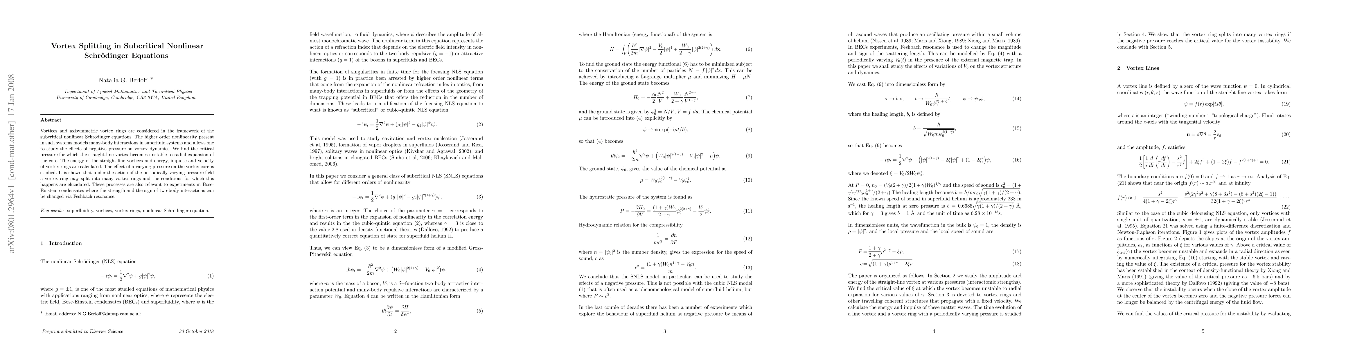 This paper investigates vortex dynamics in subcritical nonlinear Schrödinger equations, focusing on the instability of straight-line vortices under negative pressure and the splitting of vortex rings under varying pressure fields. The study elucidates the conditions for vortex splitting and its relevance to superfluid systems and Bose-Einstein condensates.