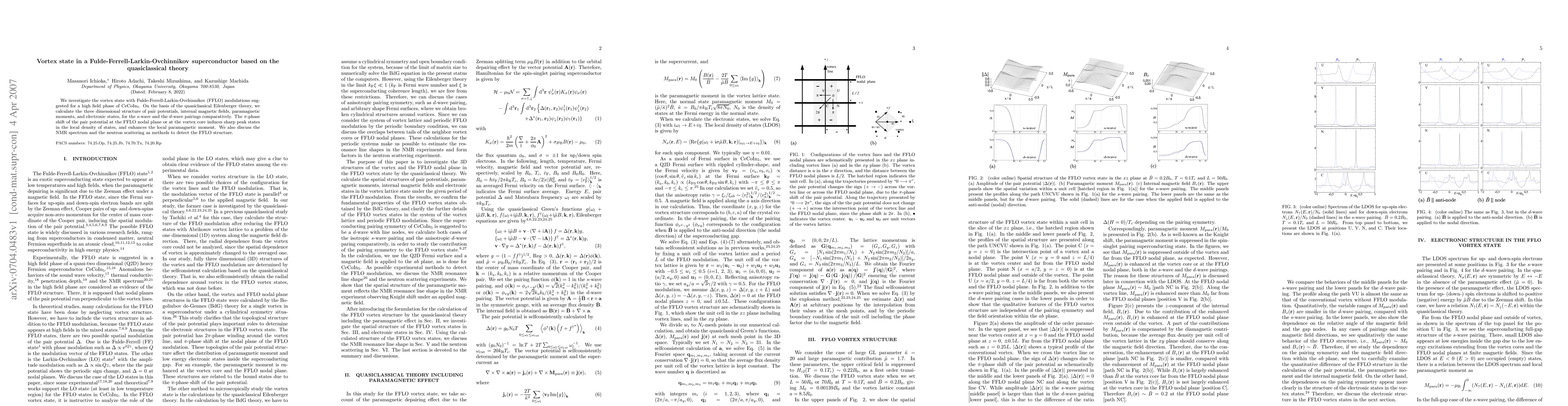 This paper explores the vortex state in a Fulde-Ferrell-Larkin-Ovchinnikov (FFLO) superconductor using quasiclassical Eilenberger theory, comparing s-wave and d-wave pairings. It highlights the impact of the π-phase shift on local density of states and paramagnetic moments, and suggests NMR and neutron scattering as detection methods.