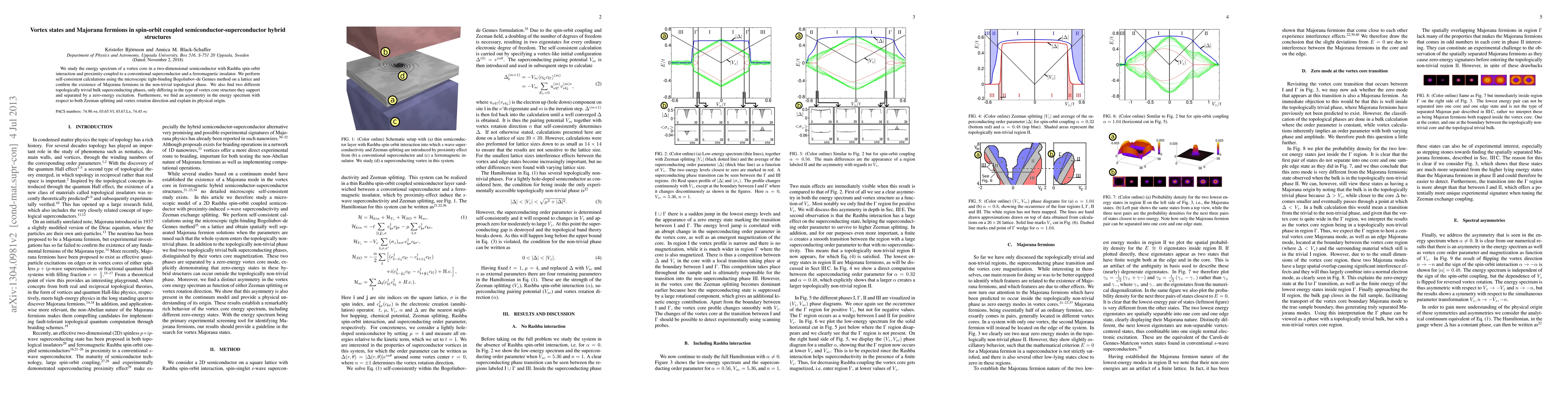 This paper investigates the energy spectrum of vortices in a spin-orbit coupled semiconductor hybridized with a superconductor and a ferromagnetic insulator, confirming the existence of Majorana fermions in a topological phase. It also identifies two topologically trivial superconducting phases distinguished by their vortex core structures and discusses the asymmetry in the energy spectrum due to Zeeman splitting and vortex rotation.