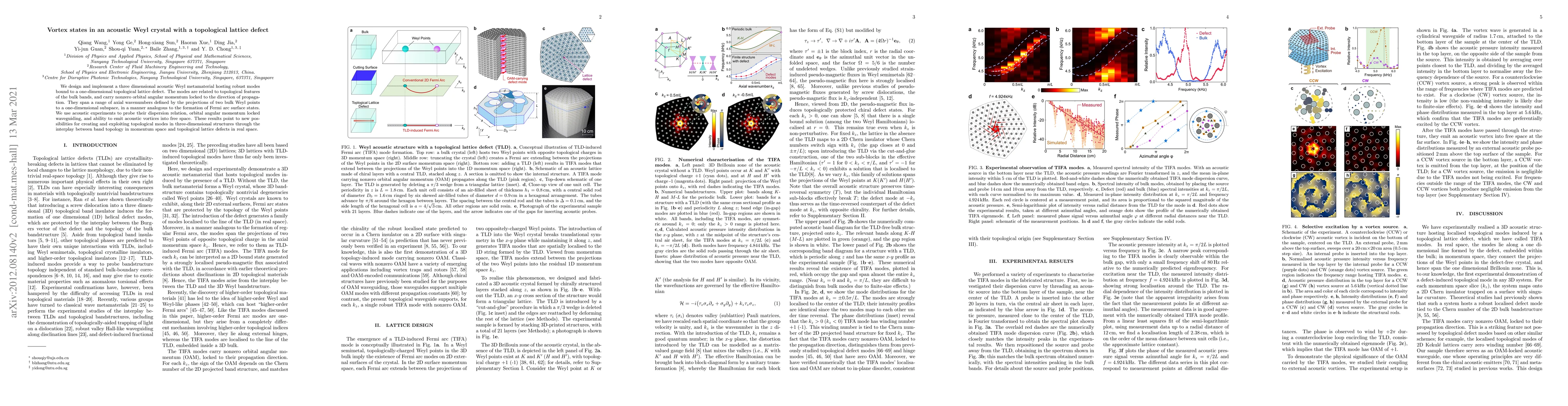 This paper designs a three-dimensional acoustic Weyl metamaterial with topological lattice defects that host robust modes carrying orbital angular momentum. Experiments reveal the dispersion relation, waveguiding, and emission of acoustic vortices, highlighting new potential for utilizing topological modes in three-dimensional structures.