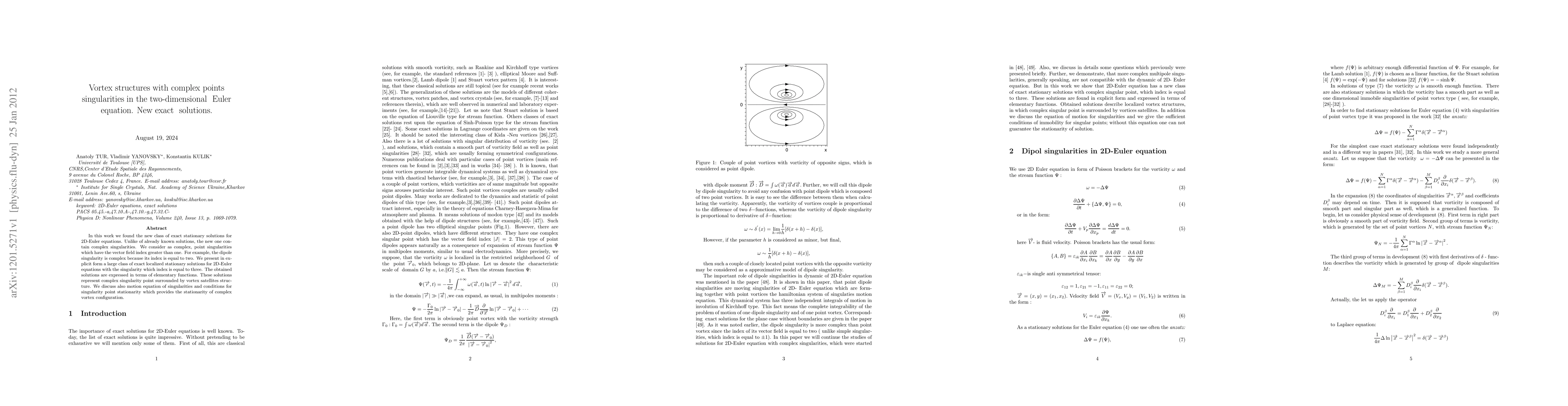 In this work we found the new class of exact stationary solutions for 2D-Euler equations. Unlike of already known solutions, the new one contain complex singularities. We consider as complex, point singularities which have the vector field index greater than one. For example, the dipole singularity is complex because its index is equal to two. We present in explicit form a large class of exact localized stationary solutions for 2D-Euler equations with the singularity which index is equal to three. The obtained solutions are expressed in terms of elementary functions. These solutions represent complex singularity point surrounded by vortex satellites structure. We discuss also motion equation of singularities and conditions for singularity point stationarity which provides the stationarity of complex vortex configuration.