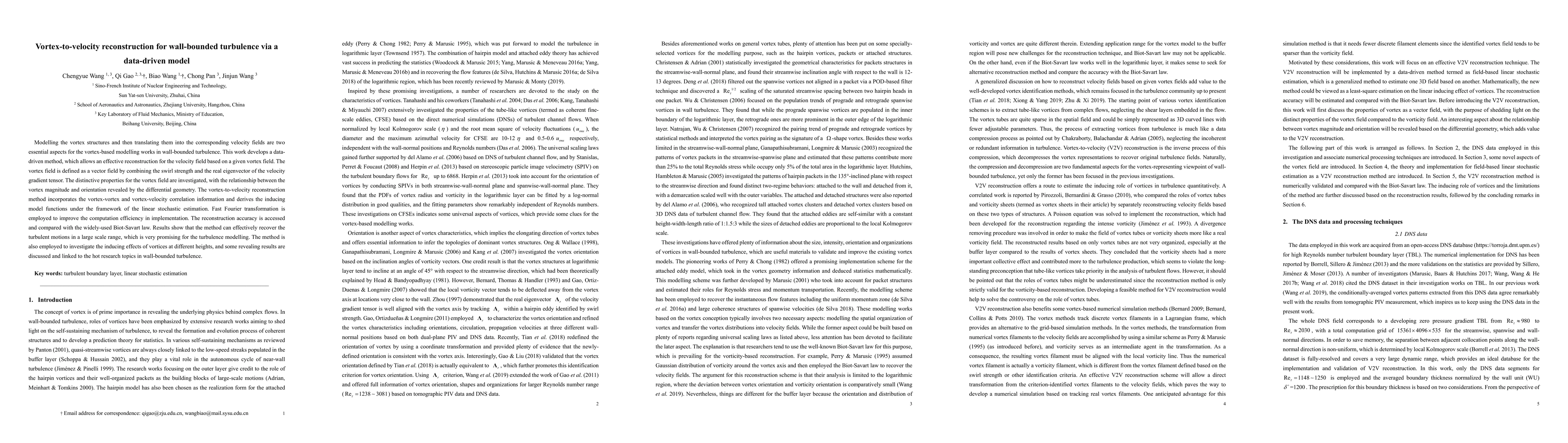 This paper develops a data-driven method for reconstructing velocity fields from vortex structures in wall-bounded turbulence, employing vortex-vortex and vortex-velocity correlations. The method shows high reconstruction accuracy compared to the Biot-Savart law and is promising for turbulence modelling.