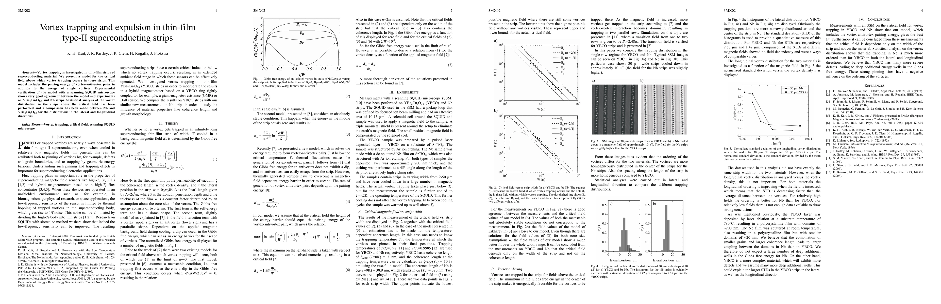 This paper models vortex trapping in thin-film type-II superconducting strips, incorporating vortex-antivortex pair energy, and validates it experimentally using a scanning SQUID microscope. The study compares vortex distributions in YBa2Cu3O7-delta and Nb strips, revealing differences in lateral and longitudinal directions.