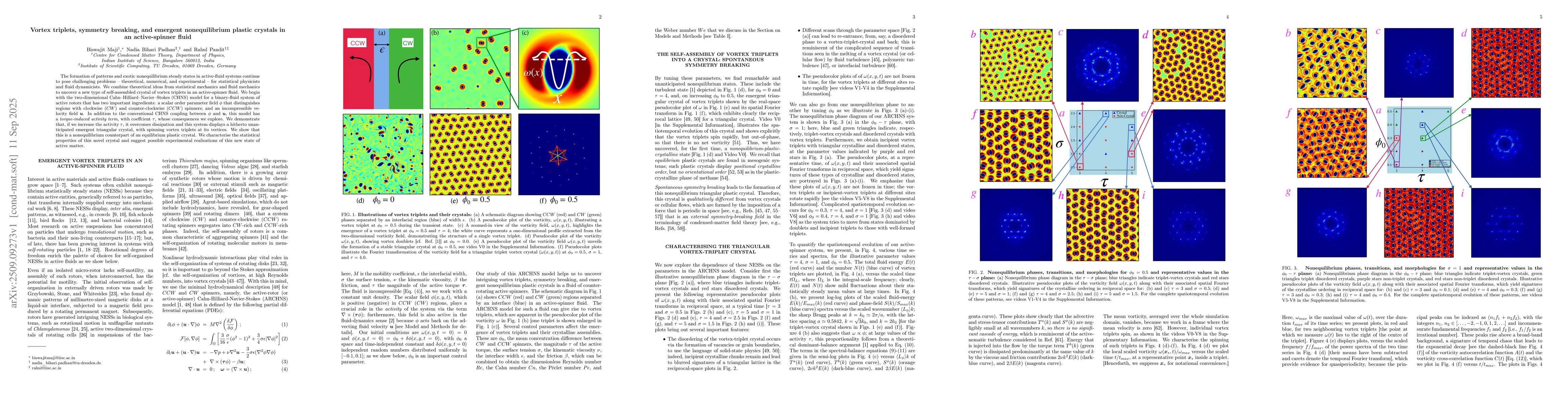 The formation of patterns and exotic nonequilibrium steady states in active-fluid systems continues to pose challenging problems -- theoretical, numerical, and experimental -- for statistical physicists and fluid dynamicists. We combine theoretical ideas from statistical mechanics and fluid mechanics to uncover a new type of self-assembled crystal of vortex triplets in an active-spinner fluid. We begin with the two-dimensional Cahn-Hilliard-Navier-Stokes (CHNS) model for a binary-fluid system of active rotors that has two important ingredients: a scalar order parameter field phi that distinguishes regions with clockwise (CW) and counter-clockwise (CCW) spinners; and an incompressible velocity field u. In addition to the conventional CHNS coupling between phi and u, this model has a torque-induced activity term, with coefficient tau, whose consequences we explore. We demonstrate that, if we increase the activity tau, it overcomes dissipation and this system displays a hitherto unanticipated emergent triangular crystal, with spinning vortex triplets at its vertices. We show that this is a nonequilibrium counterpart of an equilibrium plastic crystal. We characterise the statistical properties of this novel crystal and suggest possible experimental realisations of this new state of active matter.