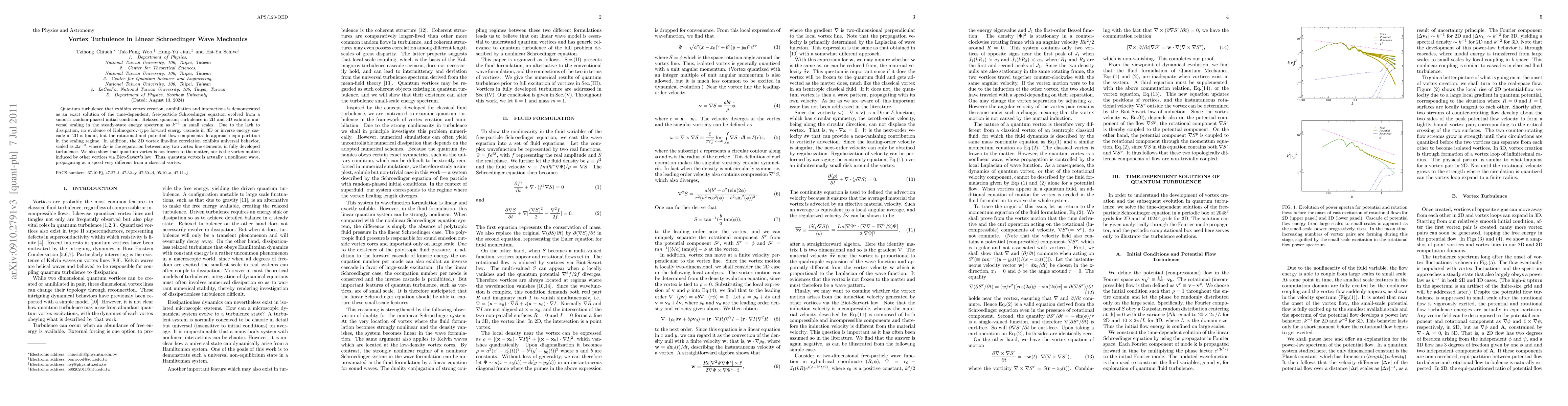 This paper demonstrates quantum turbulence in linear Schrödinger wave mechanics, showing vortex creation and interactions without dissipation. The study reveals universal scaling in the energy spectrum and vortex line correlations, indicating that quantum vortices behave as nonlinear waves rather than being constrained by classical vortex dynamics.