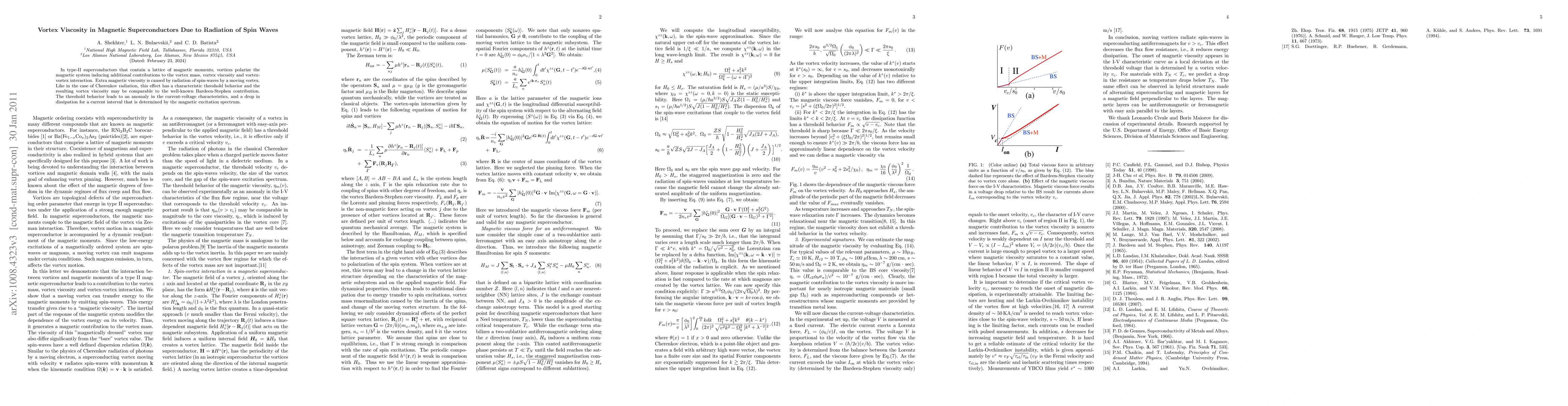 The paper presents a theoretical model describing the additional vortex viscosity in magnetic superconductors due to spin wave radiation, providing an equation for the magnetic viscous force (Fm) and deriving the magnetic viscosity (ηm) as a function of vortex velocity and material properties.
