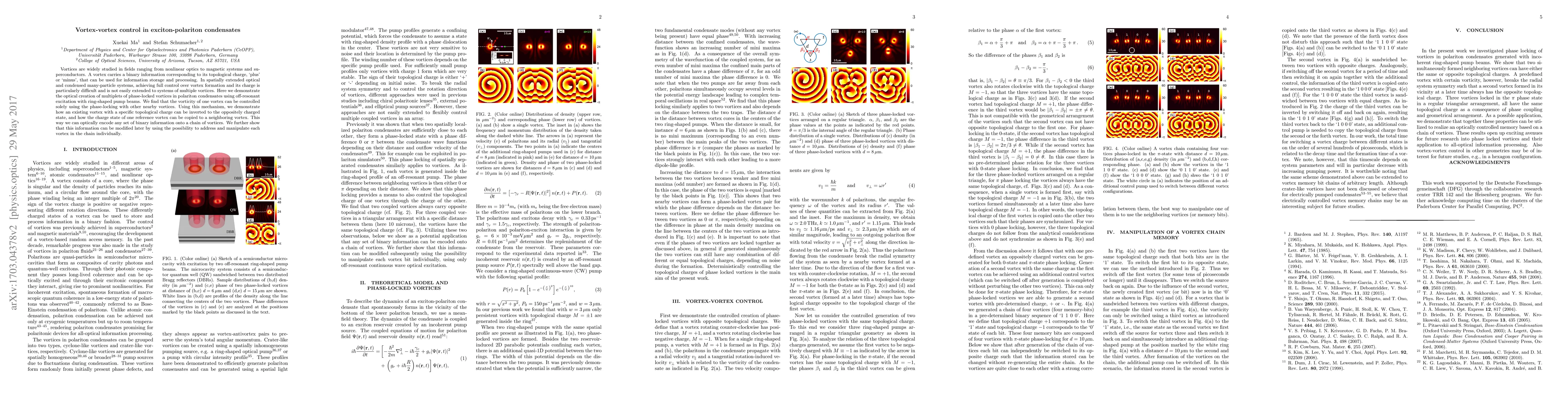 This paper demonstrates the optical creation and control of multiple phase-locked vortices in exciton-polariton condensates using off-resonant excitation. The researchers show that the topological charge of one vortex can be manipulated by phase-locking with others, enabling binary information encoding and modification.