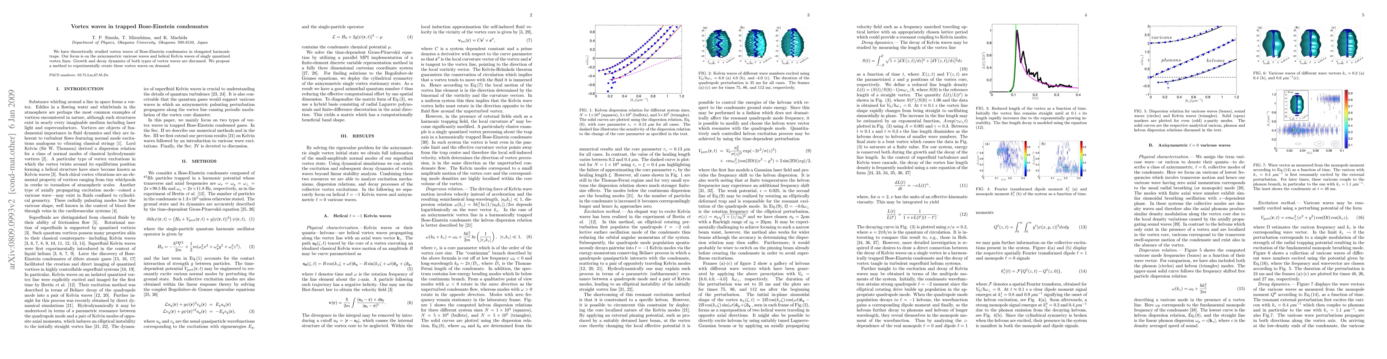 The study explores theoretically the dynamics of varicose and helical Kelvin vortex waves in elongated harmonic traps of Bose-Einstein condensates, discussing their growth and decay, and proposes an experimental method to generate these vortex waves.
