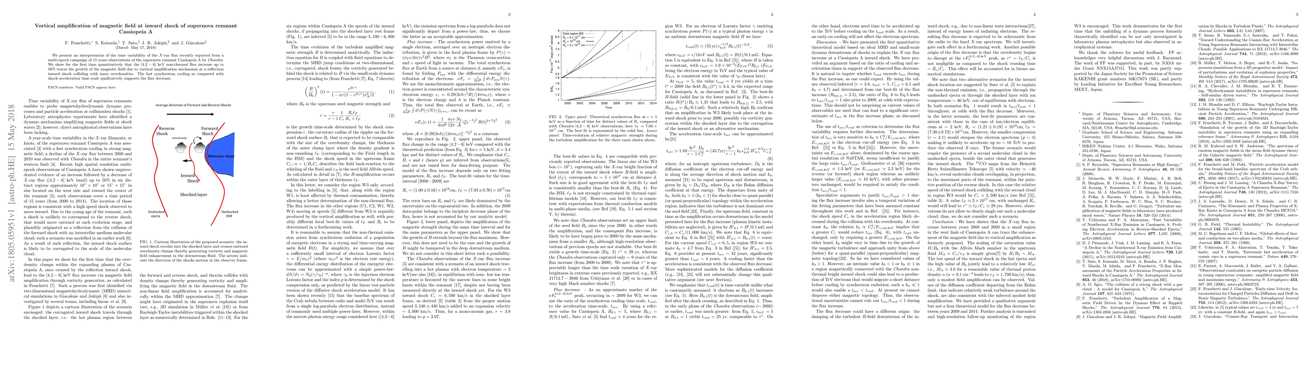 This paper demonstrates that the $X$-ray flux variability in Cassiopeia A is linked to the growth of the magnetic field via a vortical amplification mechanism at an inward shock. The $[4.2-6]$ keV non-thermal flux increase up to $50\%$ is attributed to this mechanism, while the subsequent flux decrease is supported by fast synchrotron cooling.