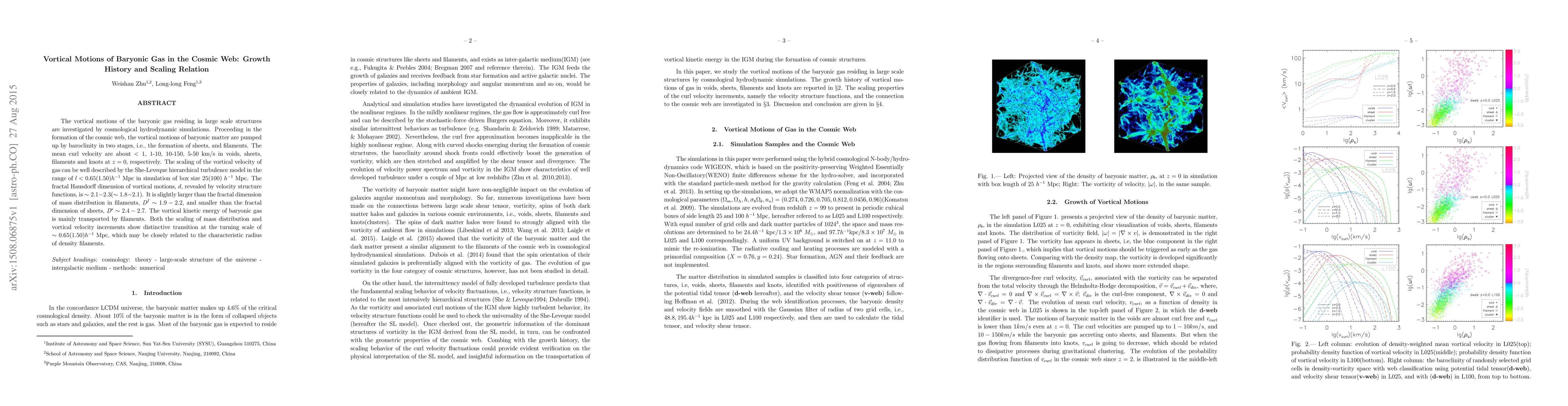 This paper investigates the vortical motions of baryonic gas in cosmic web structures using cosmological simulations, finding that these motions are driven by baroclinity and scale with the She-Leveque turbulence model. The vortical kinetic energy is primarily transported by filaments, with distinct scaling transitions at characteristic scales.