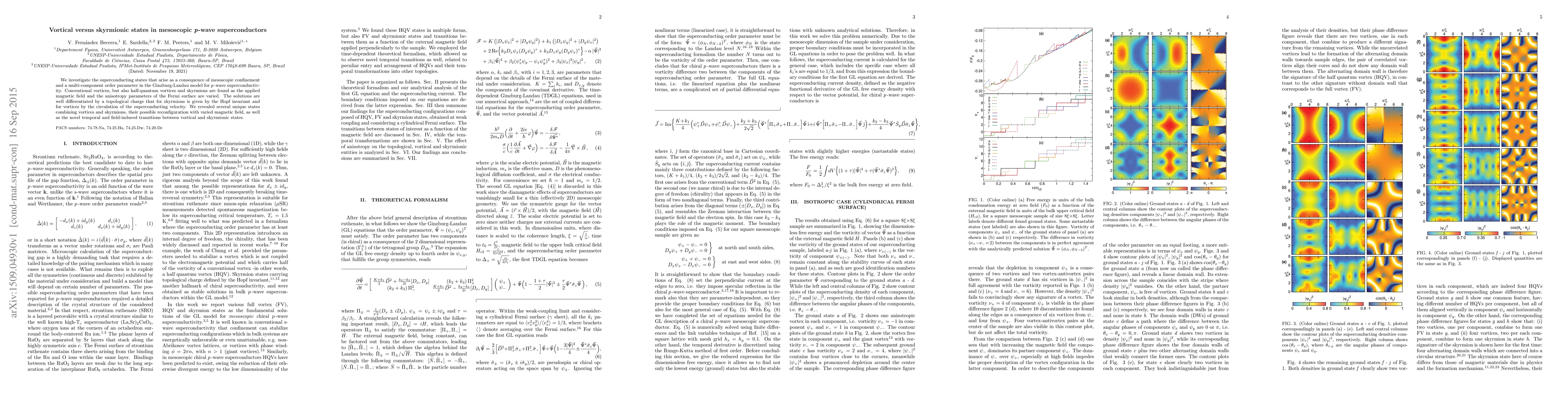 We investigate the superconducting states that arise as a consequence of mesoscopic confinement and a multi-component order parameter in the Ginzburg-Landau model for $p\,$-wave superconductivity. Conventional vortices, but also half-quantum vortices and skyrmions are found as the applied magnetic field and the anisotropy parameters of the Fermi surface are varied. The solutions are well differentiated by a topological charge that for skyrmions is given by the Hopf invariant and for vortices by the circulation of the superconducting velocity. We revealed several unique states combining vortices and skyrmions, their possible reconfiguration with varied magnetic field, as well as the novel temporal and field-induced transitions between vortical and skyrmionic states.