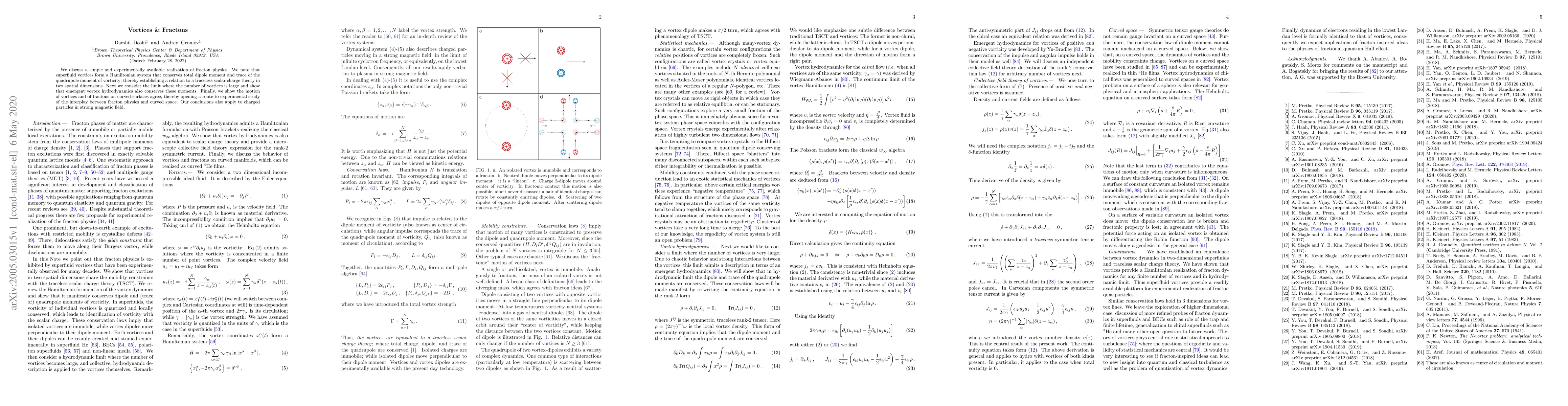 We discuss a simple and experimentally available realization of fracton physics. We note that superfluid vortices form a Hamiltonian system that conserves total dipole moment and trace of the quadrupole moment of vorticity; thereby establishing a relation to a traceless scalar charge theory in two spatial dimensions. Next we consider the limit where the number of vortices is large and show that emergent vortex hydrodynamics also conserves these moments. Finally, we show the motion of vortices and of fractons on curved surfaces agree, thereby opening a route to experimental study of the interplay between fracton physics and curved space. Our conclusions also apply to charged particles in strong magnetic field.