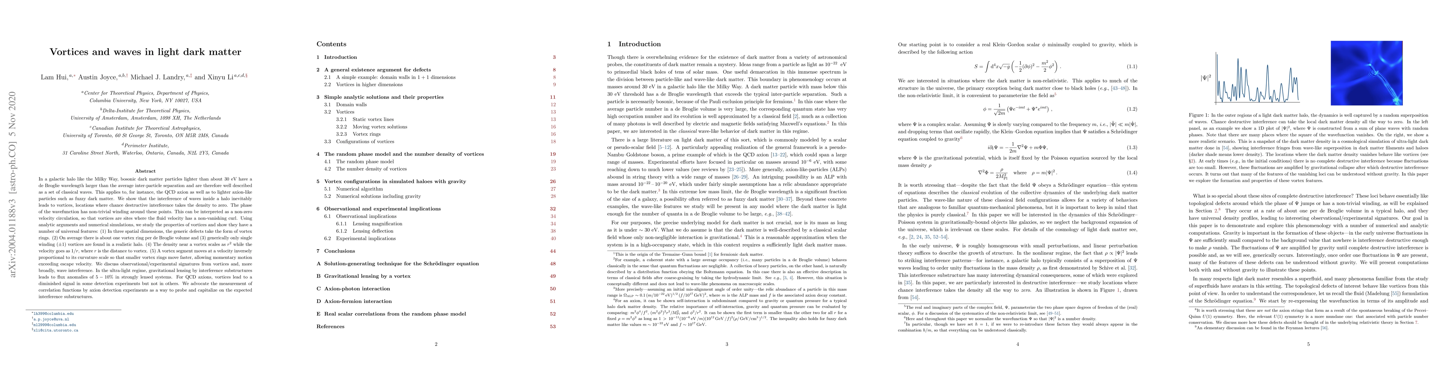 This paper explores the formation of vortices in bosonic dark matter, such as axions, due to wave interference in galactic halos. It finds that these vortices exhibit universal properties, including vortex rings, a density scaling of $r^2$, and velocity scaling of $1/r$. The study suggests potential observational signatures, including gravitational lensing anomalies and implications for axion detection experiments.