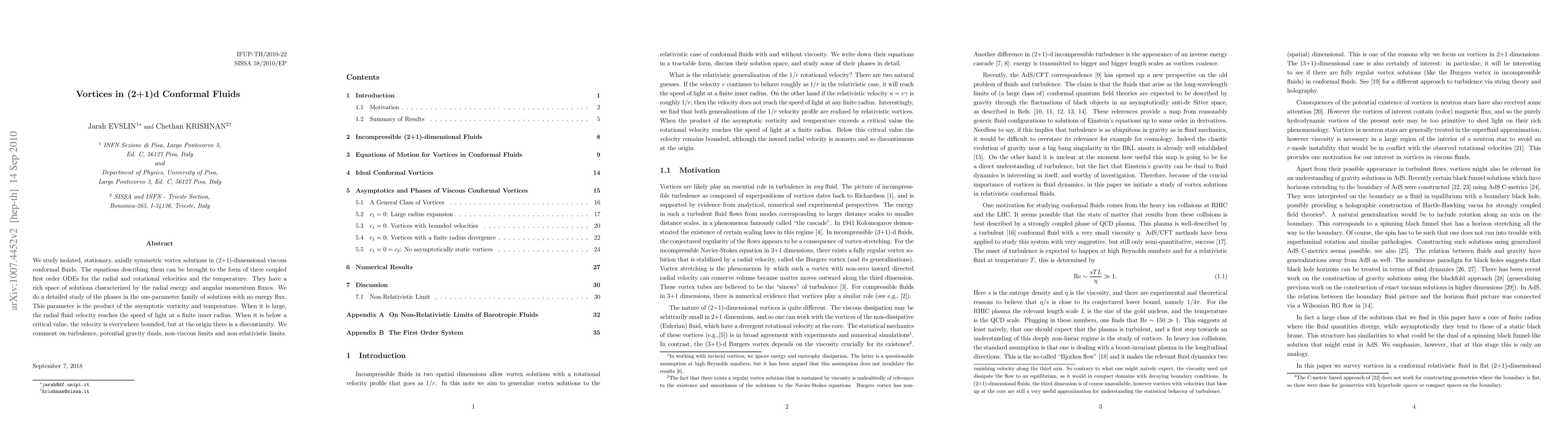 We study isolated, stationary, axially symmetric vortex solutions in (2+1)-dimensional viscous conformal fluids. The equations describing them can be brought to the form of three coupled first order ODEs for the radial and rotational velocities and the temperature. They have a rich space of solutions characterized by the radial energy and angular momentum fluxes. We do a detailed study of the phases in the one-parameter family of solutions with no energy flux. This parameter is the product of the asymptotic vorticity and temperature. When it is large, the radial fluid velocity reaches the speed of light at a finite inner radius. When it is below a critical value, the velocity is everywhere bounded, but at the origin there is a discontinuity. We comment on turbulence, potential gravity duals, non-viscous limits and non-relativistic limits.
