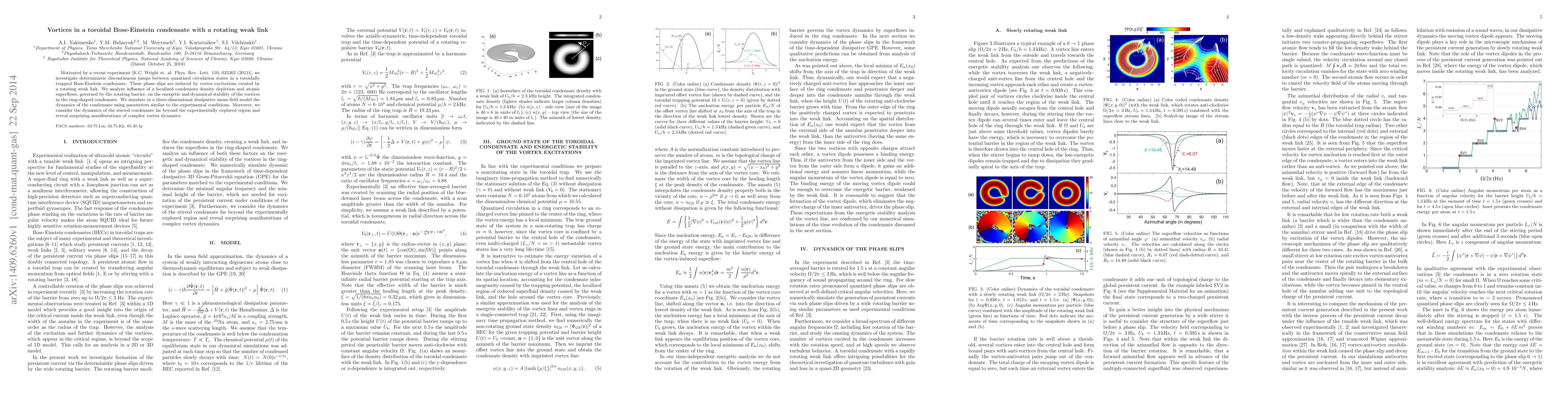 Motivated by a recent experiment [K.C. Wright et. al. Phys. Rev. Lett. 110, 025302 (2013)], we investigate deterministic discontinuous jumps between quantized circulation states in a toroidally trapped Bose-Einstein condensate. These phase slips are induced by vortex excitations created by a rotating weak link. We analyze influence of a localized condensate density depletion and atomic superflows, governed by the rotating barrier, on the energetic and dynamical stability of the vortices in the ring-shaped condensate. We simulate in a three-dimensional dissipative mean field model the dynamics of the condensate using parameters similar to the experimental conditions. Moreover, we consider the dynamics of the stirred condensate far beyond the experimentally explored region and reveal surprising manifestations of complex vortex dynamics.
