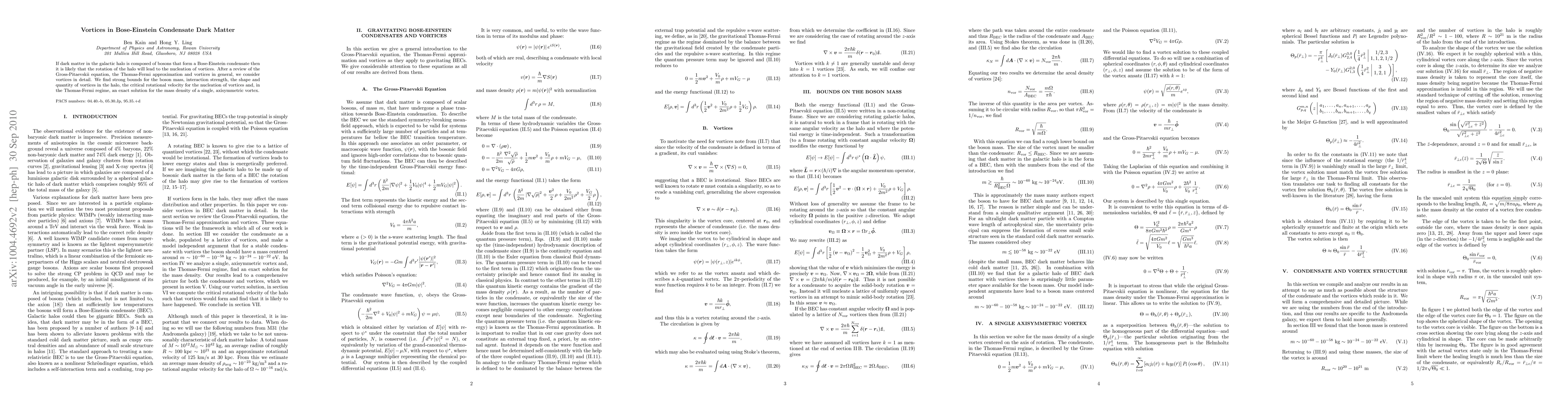 This paper explores the formation of vortices in a Bose-Einstein condensate model of dark matter within galactic halos, deriving strong bounds on boson mass, interaction strength, and vortex characteristics, and providing an exact solution for the mass density of axisymmetric vortices in the Thomas-Fermi regime.