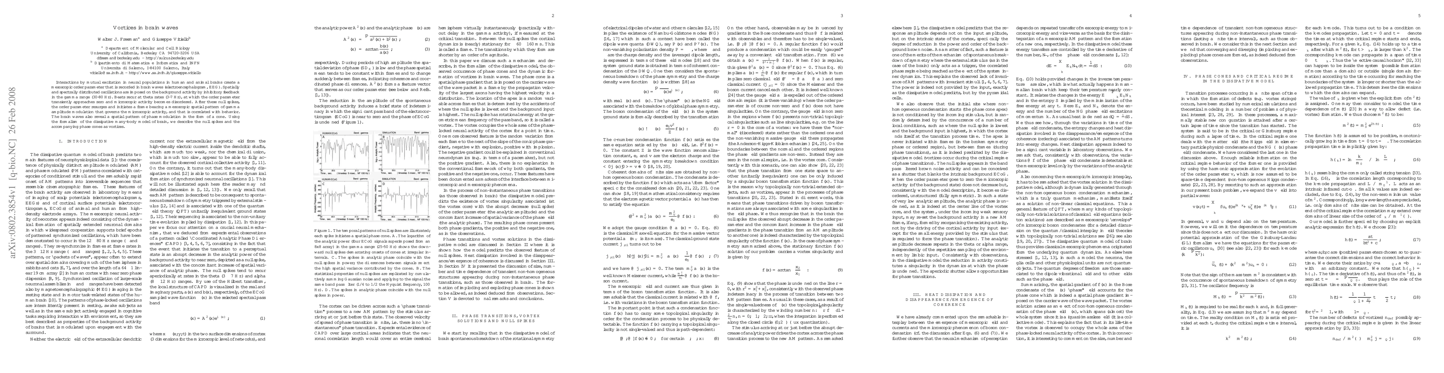 Interactions by mutual excitation in neural populations in human and animal brains create a mesoscopic order parameter that is recorded in brain waves (electroencephalogram, EEG). Spatially and spectrally distributed oscillations are imposed on the background activity by inhibitory feedback in the gamma range (30-80 Hz). Beats recur at theta rates (3-7 Hz), at which the order parameter transiently approaches zero and microscopic activity becomes disordered. After these null spikes, the order parameter resurges and initiates a frame bearing a mesoscopic spatial pattern of gamma amplitude modulation that governs the microscopic activity, and that is correlated with behavior. The brain waves also reveal a spatial pattern of phase modulation in the form of a cone. Using the formalism of the dissipative many-body model of brain, we describe the null spikes and the accompanying phase cones as vortices.