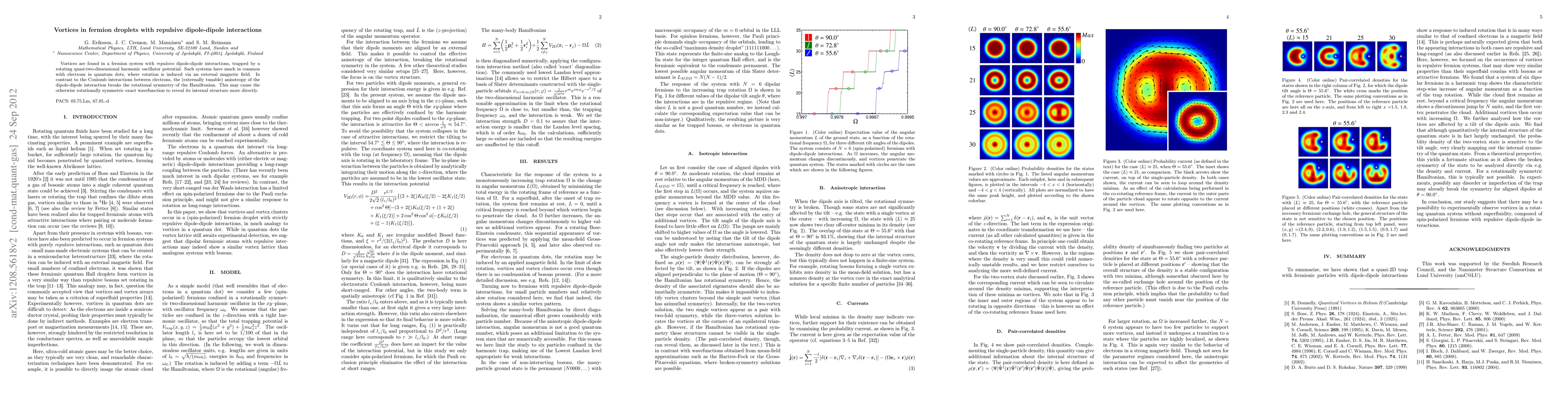 This paper investigates vortices in fermion droplets with repulsive dipole-dipole interactions, revealing a system analogous to electrons in quantum dots. The anisotropy of the dipole-dipole interaction breaks rotational symmetry, potentially exposing the internal structure of the wavefunction more directly.