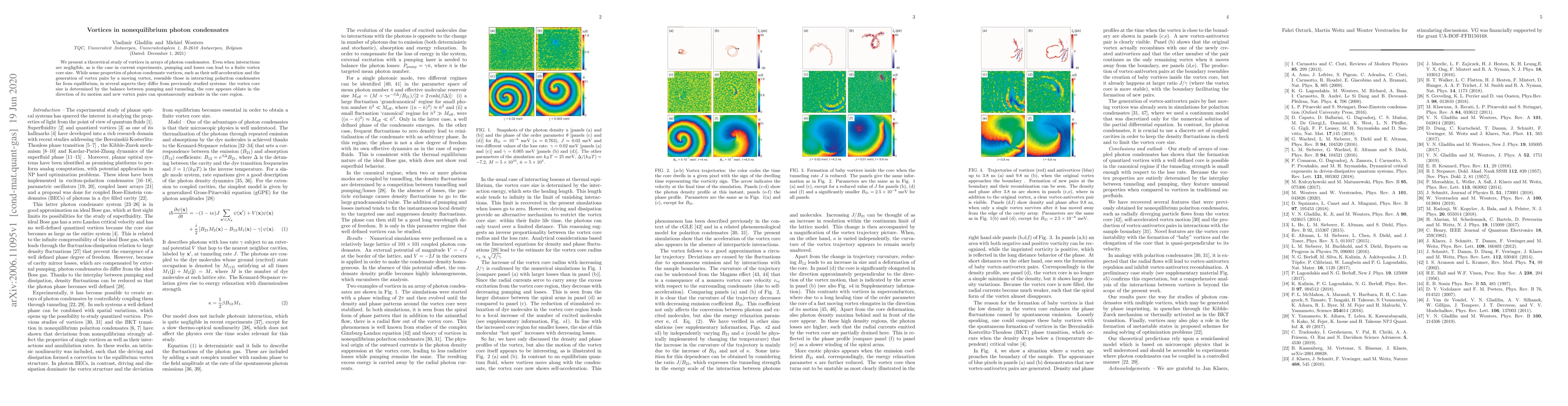The paper presents a theoretical framework for understanding vortex behavior in photon condensates, emphasizing the role of pumping, tunneling, and losses in shaping vortex properties.