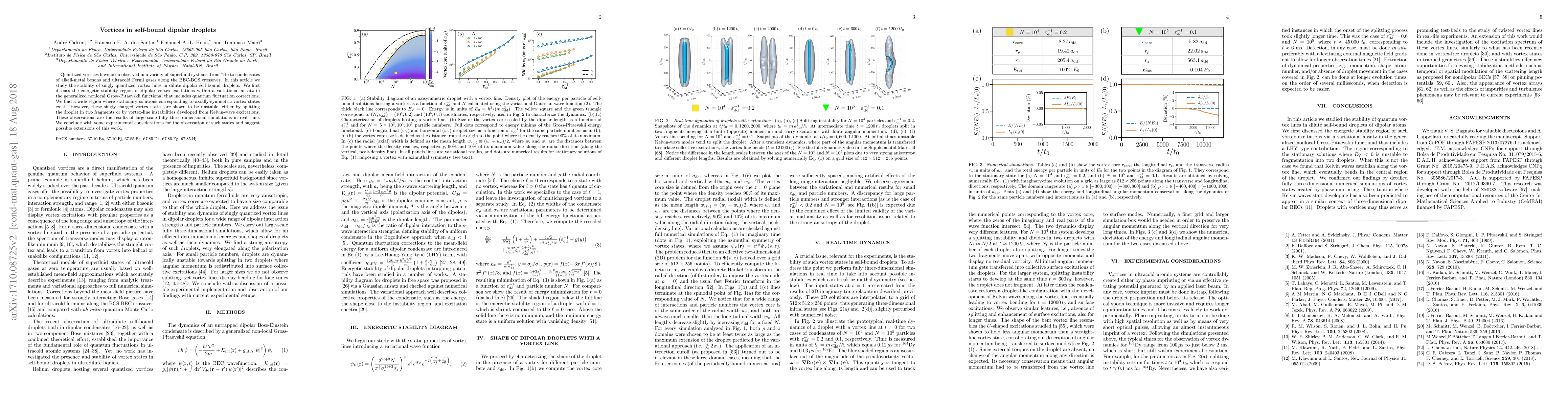 This paper investigates the stability of quantized vortices in dipolar self-bound droplets, finding that while axially-symmetric vortex states exist, they are unstable due to splitting or Kelvin-wave excitations, as demonstrated through large-scale three-dimensional simulations. Experimental considerations for observing these states are also discussed.