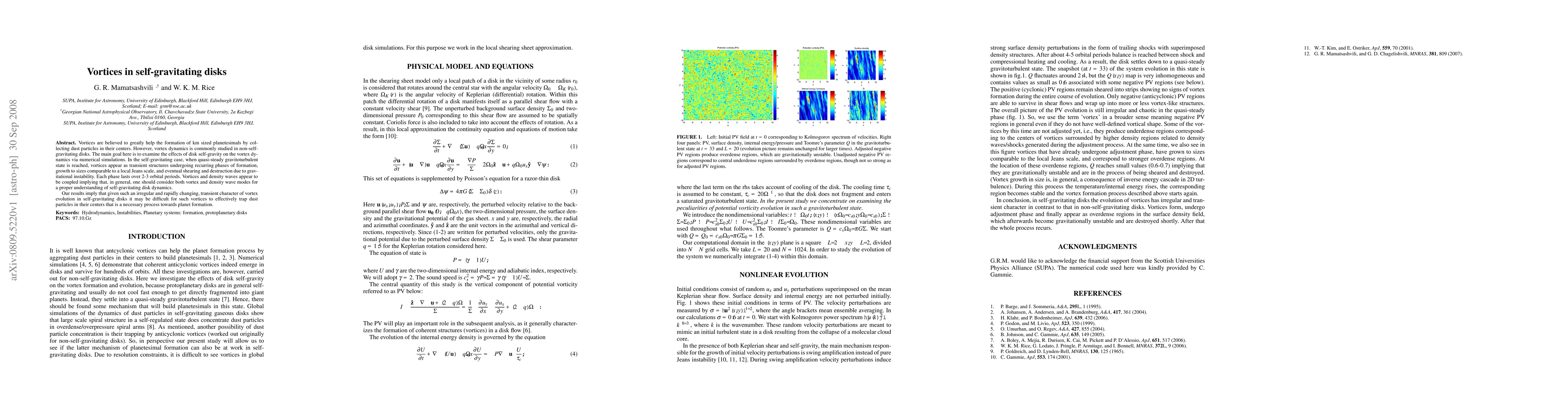 Numerical simulations were used to study vortex dynamics in self-gravitating disks