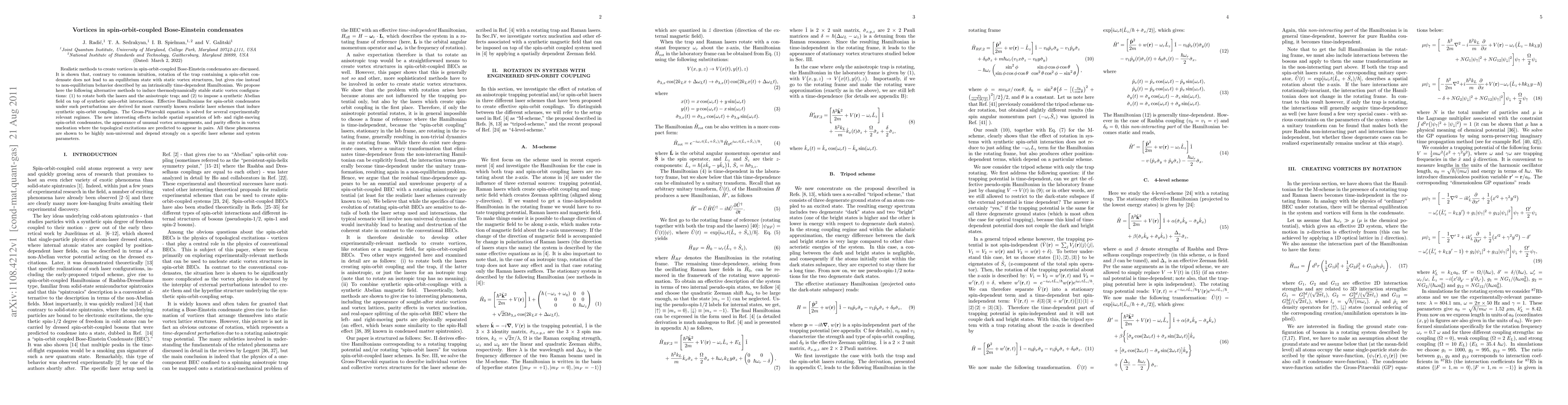 Realistic methods to create vortices in spin-orbit-coupled Bose-Einstein condensates are discussed. It is shown that, contrary to common intuition, rotation of the trap containing a spin-orbit condensate does not lead to an equilibrium state with static vortex structures, but gives rise instead to non-equilibrium behavior described by an intrinsically time-dependent Hamiltonian. We propose here the following alternative methods to induce thermodynamically stable static vortex configurations: (1) to rotate both the lasers and the anisotropic trap; and (2) to impose a synthetic Abelian field on top of synthetic spin-orbit interactions. Effective Hamiltonians for spin-orbit condensates under such perturbations are derived for most currently known realistic laser schemes that induce synthetic spin-orbit couplings. The Gross-Pitaevskii equation is solved for several experimentally relevant regimes. The new interesting effects include spatial separation of left- and right-moving spin-orbit condensates, the appearance of unusual vortex arrangements, and parity effects in vortex nucleation where the topological excitations are predicted to appear in pairs. All these phenomena are shown to be highly non-universal and depend strongly on a specific laser scheme and system parameters.
