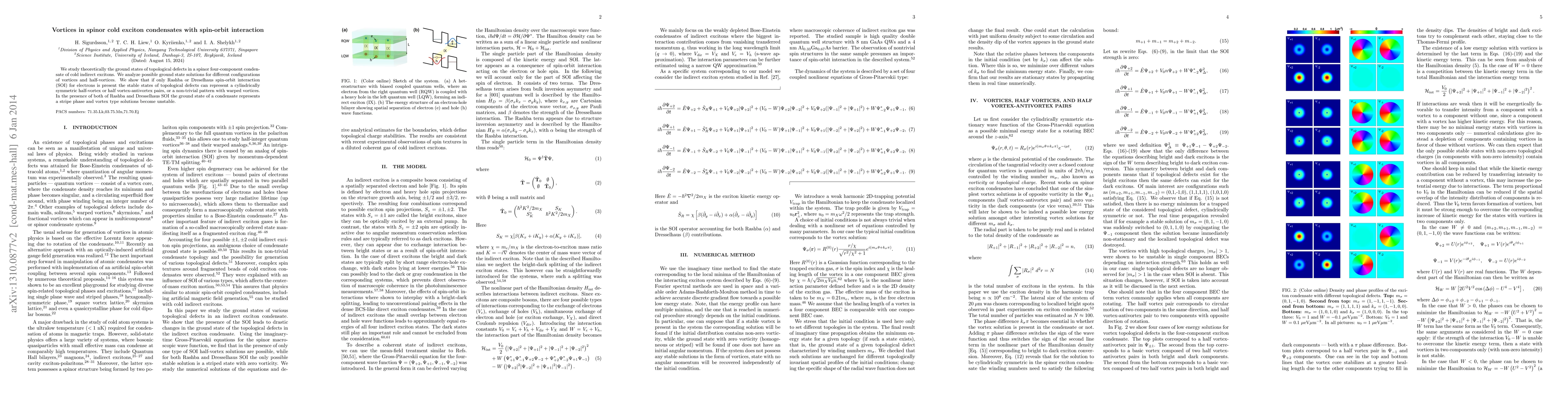 We study theoretically the ground states of topological defects in a spinor four-component condensate of cold indirect excitons. We analyze possible ground state solutions for different configurations of vortices and half-vortices. We show that if only Rashba or Dreselhaus spin-orbit interaction (SOI) for electrons is present the stable states of topological defects can represent a cylindrically symmetric half-vortex or half vortex-antivortex pairs, or a non-trivial pattern with warped vortices. In the presence of both of Rashba and Dresselhaus SOI the ground state of a condensate represents a stripe phase and vortex type solutions become unstable.