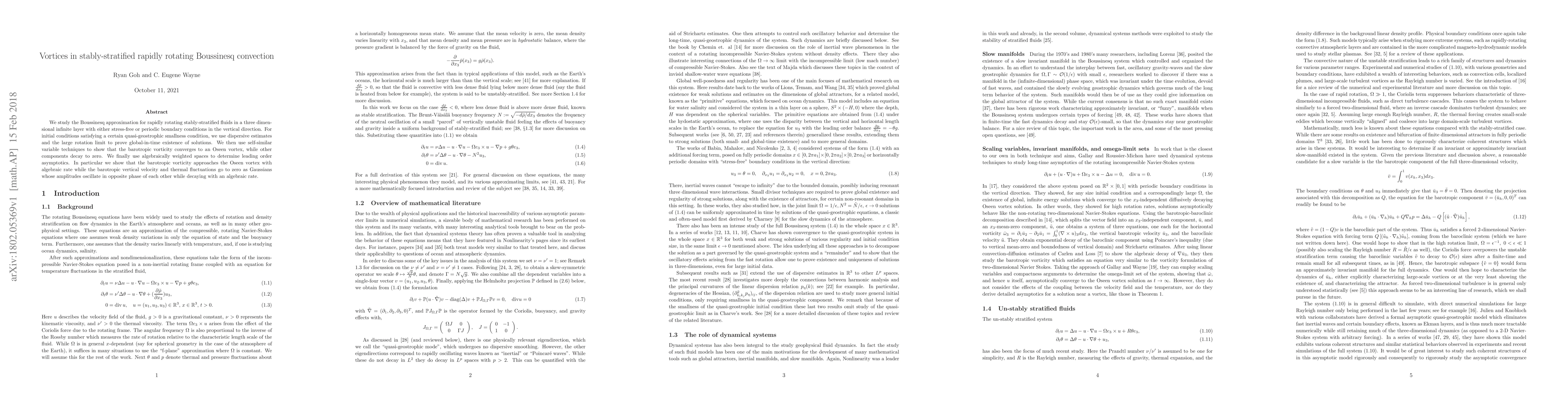 This paper proves global-in-time existence of solutions for rapidly rotating, stably-stratified Boussinesq convection under certain initial conditions. It shows that the barotropic vorticity converges to an Oseen vortex with an algebraic rate, while other components decay to zero as Gaussians.