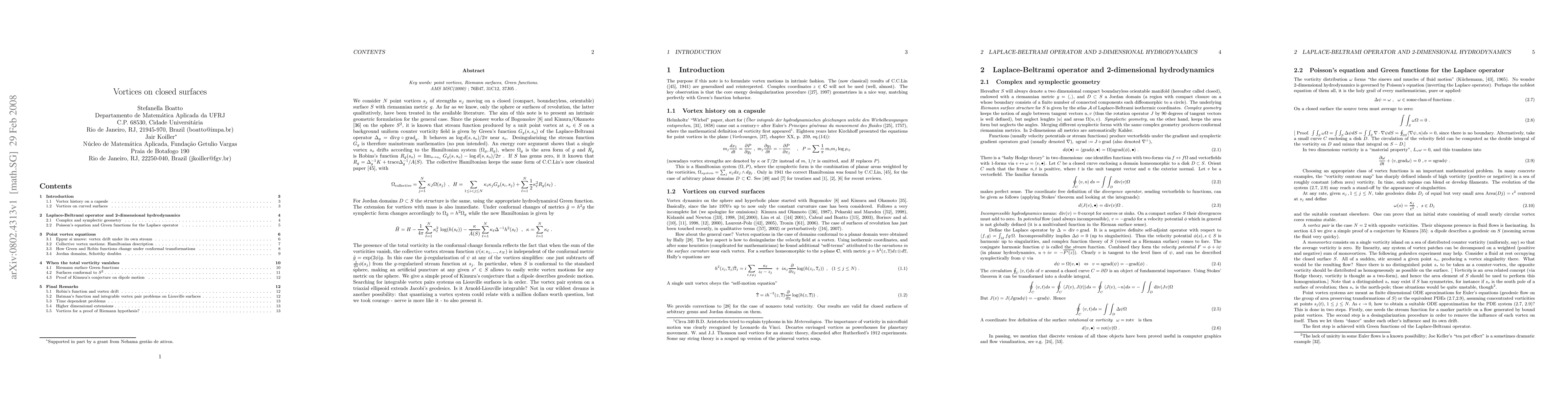 We consider $N$ point vortices $s_j$ of strengths $\kappa_j$ moving on a closed (compact, boundaryless, orientable) surface $S$ with riemannian metric $g$. As far as we know, only the sphere or surfaces of revolution, the latter qualitatively, have been treated in the available literature. The aim of this note is to present an intrinsic geometric formulation for the general case. We give a simple proof of Kimura's conjecture that a dipole describes geodesic motion. Searching for integrable vortex pairs systems on Liouville surfaces is in order. The vortex pair system on a triaxial ellipsoid extends Jacobi's geodesics. Is it Arnold-Liouville integrable? Not in our wildest dreams is another possibility: that quantizing a vortex system could relate with a million dollars worth question, but we took courage - nerve is more like it - to also present it.
