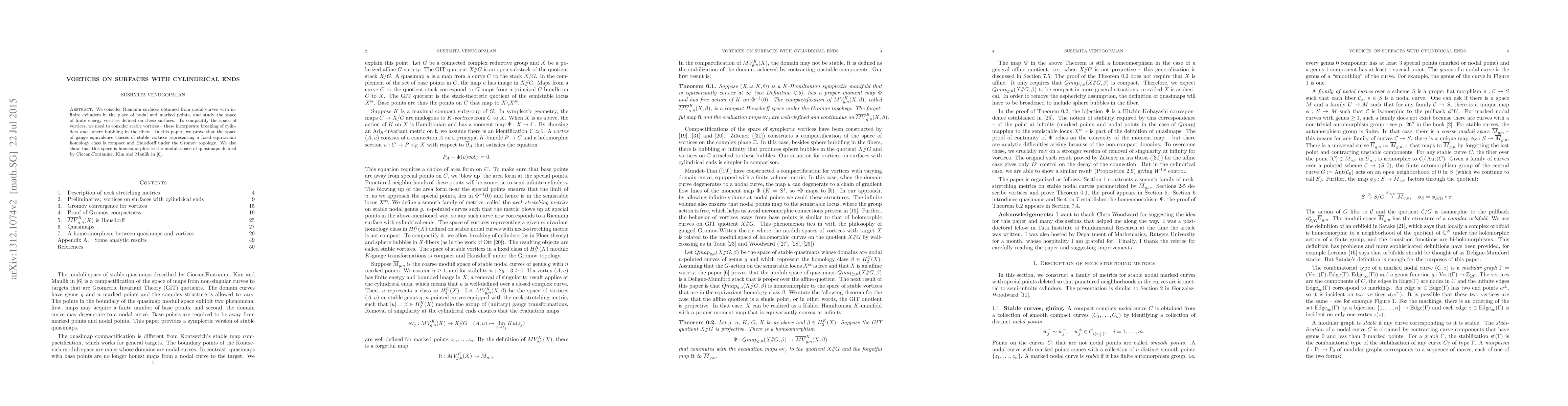 This paper studies finite energy vortices on Riemann surfaces formed from nodal curves with cylindrical ends, proving that the space of gauge equivalence classes of stable vortices is compact and Hausdorff under the Gromov topology, and showing it is homeomorphic to the moduli space of quasimaps.