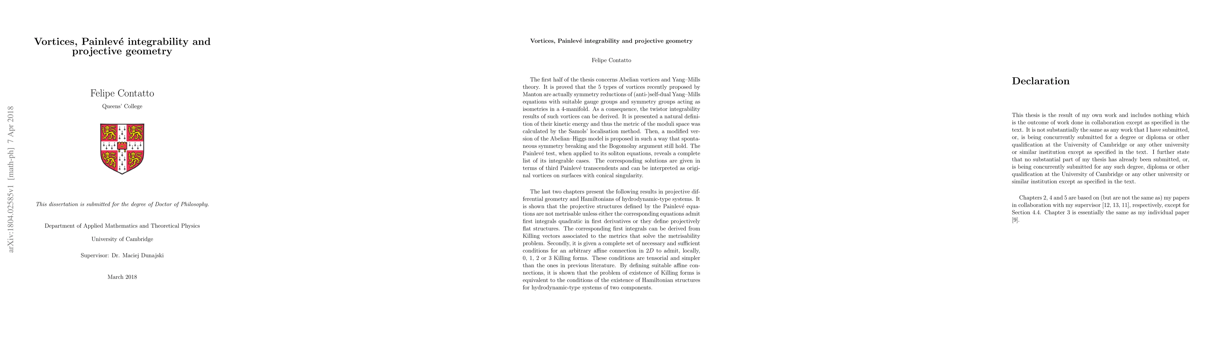 The first half of the thesis concerns Abelian vortices and Yang-Mills (YM) theory. It is proved that the 5 types of vortices recently proposed by Manton are symmetry reductions of (A)SDYM equations with suitable gauge groups and symmetry groups acting as isometries in a 4-manifold. As a consequence, the twistor integrability results of such vortices can be derived. It is presented a natural definition of their kinetic energy and thus the metric of the moduli space was calculated by the Samols' localisation method. Then, a modified version of the Abelian-Higgs model is proposed in such a way that spontaneous symmetry breaking and the Bogomolny argument still hold. The Painlev\'e test, when applied to its soliton equations, reveals a complete list of its integrable cases. The corresponding solutions are given in terms of third Painlev\'e transcendents and can be interpreted as original vortices on surfaces with conical singularity. The last two chapters present the following results in projective differential geometry and Hamiltonians of hydrodynamic-type (HT) systems. It is shown that the projective structures defined by the Painlev\'e equations are not metrisable unless either the corresponding equations admit first integrals quadratic in first derivatives or they define projectively flat structures. The corresponding first integrals can be derived from Killing vectors associated to the metrics that solve the metrisability problem. Secondly, it is given a complete set of necessary and sufficient conditions for an arbitrary affine connection in 2D to admit, locally, 0, 1, 2 or 3 Killing forms. These conditions are tensorial and simpler than the ones in previous literature. By defining suitable affine connections, it is shown that the problem of existence of Killing forms is equivalent to the conditions of the existence of Hamiltonian structures for HT systems of two components.