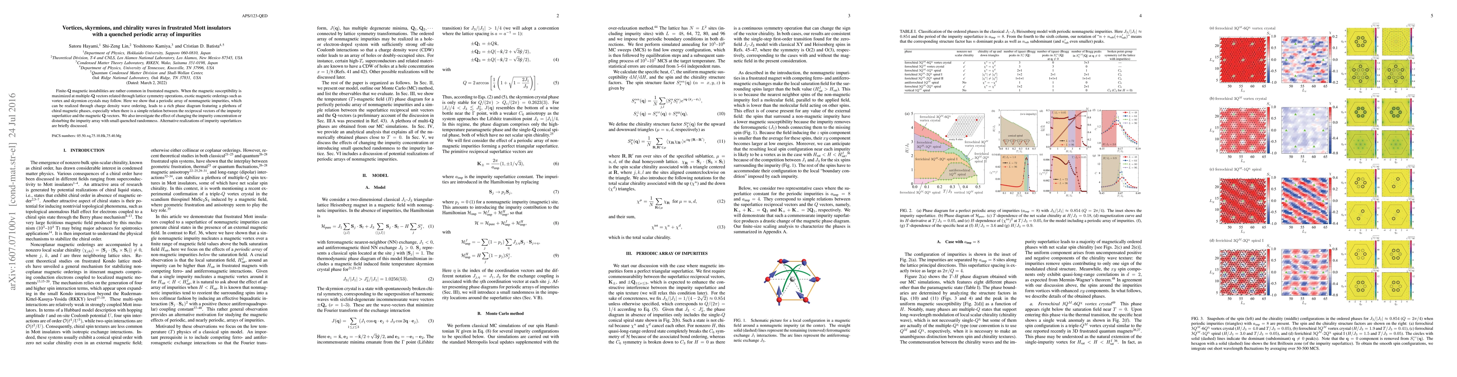 Finite-${\mathbf Q}$ magnetic instabilities are rather common in frustrated magnets. When the magnetic susceptibility is maximized at multiple-${\mathbf Q}$ vectors related through lattice symmetry operations, exotic magnetic orderings such as vortex and skyrmion crystals may follow. Here we show that a periodic array of nonmagnetic impurities, which can be realized through charge density wave ordering, leads to a rich phase diagram featuring a plethora of chiral magnetic phases, especially when there is a simple relation between the reciprocal vectors of the impurity superlattice and the magnetic ${\mathbf Q}$-vectors. We also investigate the effect of changing the impurity concentration or disturbing the impurity array with small quenched randomness. Alternative realizations of impurity superlattices are briefly discussed.