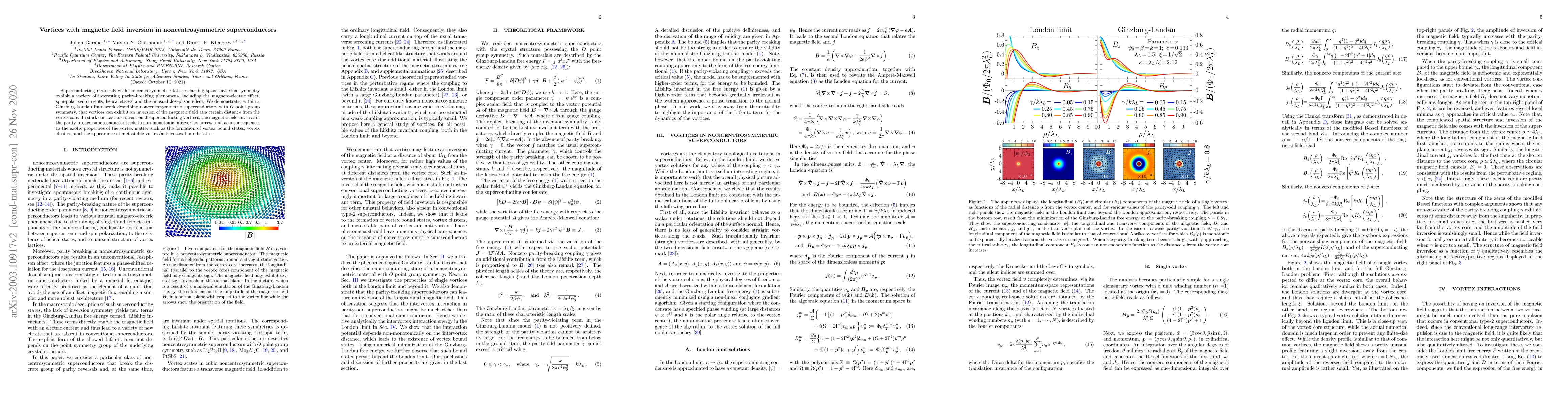 Superconducting materials with noncentrosymmetric lattices lacking space inversion symmetry exhibit a variety of interesting parity-breaking phenomena, including the magneto-electric effect, spin-polarized currents, helical states, and the unusual Josephson effect. We demonstrate, within a Ginzburg-Landau framework describing noncentrosymmetric superconductors with $O$ point group symmetry, that vortices can exhibit an inversion of the magnetic field at a certain distance from the vortex core. In stark contrast to conventional superconducting vortices, the magnetic-field reversal in the parity-broken superconductor leads to non-monotonic intervortex forces, and, as a consequence, to the exotic properties of the vortex matter such as the formation of vortex bound states, vortex clusters, and the appearance of metastable vortex/anti-vortex bound states.