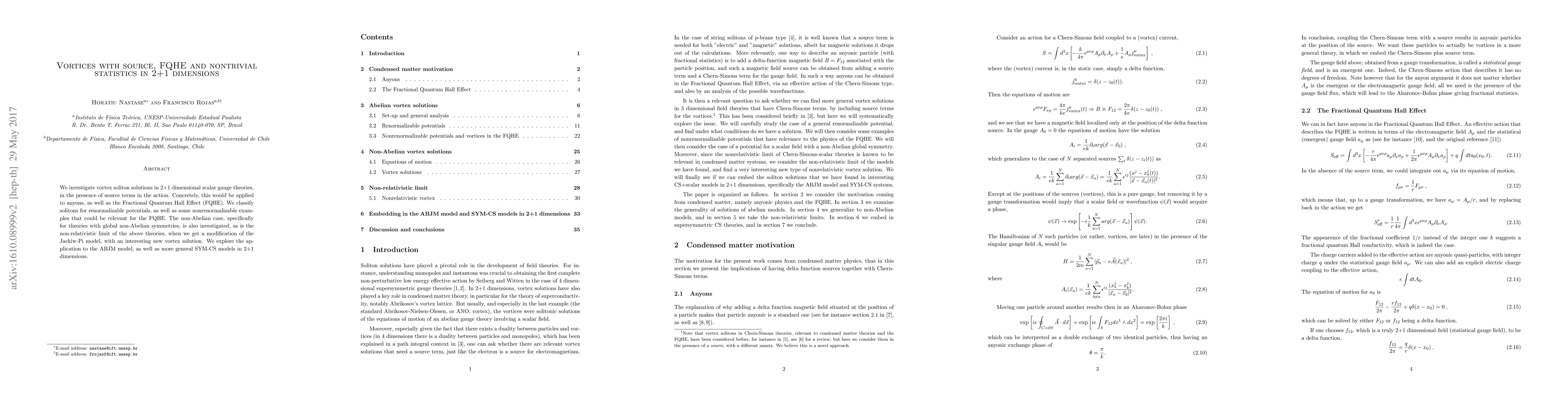 We investigate vortex soliton solutions in 2+1 dimensional scalar gauge theories, in the presence of source terms in the action. Concretely, this would be applied to anyons, as well as the Fractional Quantum Hall Effect (FQHE). We classify solitons for renormalizable potentials, as well as some nonrenormalizable examples that could be relevant for the FQHE. The non-Abelian case, specifically for theories with global non-Abelian symmetries, is also investigated, as is the non-relativistic limit of the above theories, when we get a modification of the Jackiw-Pi model, with an interesting new vortex solution. We explore the application to the ABJM model, as well as more general SYM-CS models in 2+1 dimensions.